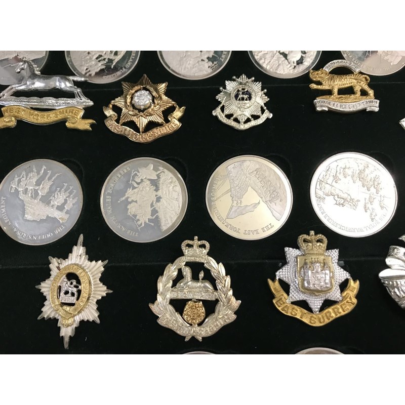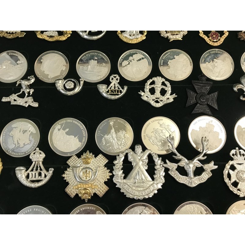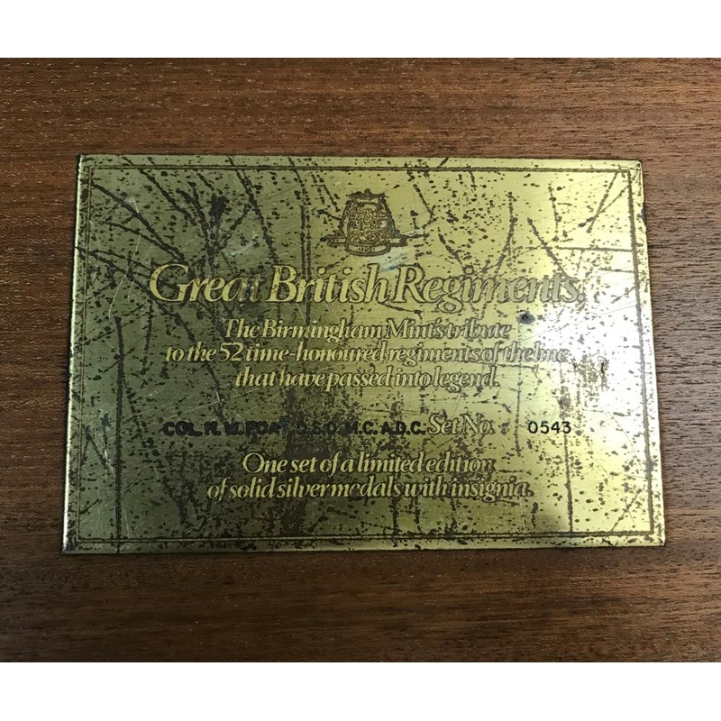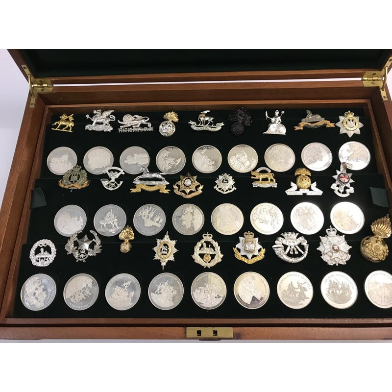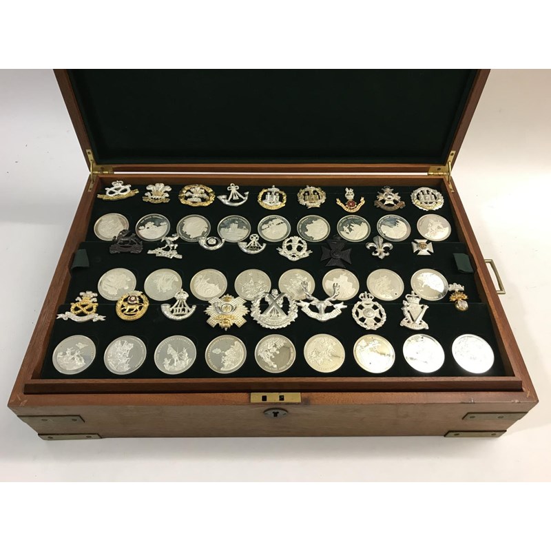 A collection of 52 silver proof medals celebrating the British Regiments, each c44g, hallmarked for Birmingham 1976 and 1977. With 52 cap badges for each of the Regiments, in a fitted case with two removable trays, 48 leaflets giving details of the regiments. The fitted case with brass tablet 'The British Regiments' Set number 543 and details of previous owner 'Col H.W. Poat DSO MC ADC,