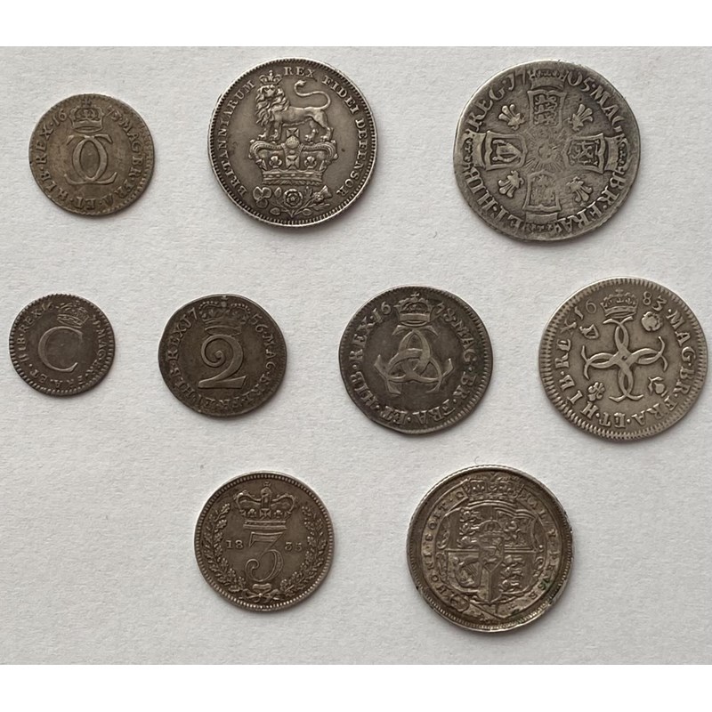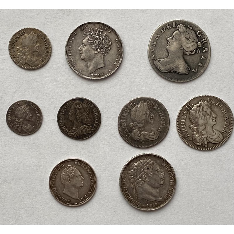 Early silver coins comprising: Charles II silver penny dated 1671, similar 2d dated 1673, 3d dated 1678 and silver 4d sated 1683. George II silver 2d dated 1756, William IV 3d dated 1835. Queen Anne Sixpence dated 1705, George III sixpence dated 1817 and a George IV Sixpence dated 1826. 9 coins.