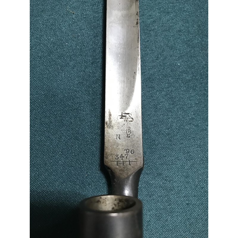An 1895 Pattern Martini Enfield bayonet with a 64cm triform blade with various stamped marks ' 347 '96 16E' and others. In a brass mounted leather scabbard with War Department arrow, 66cm