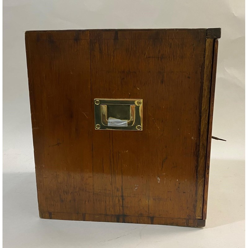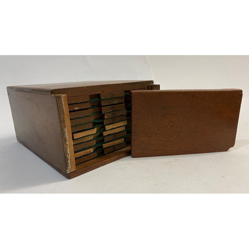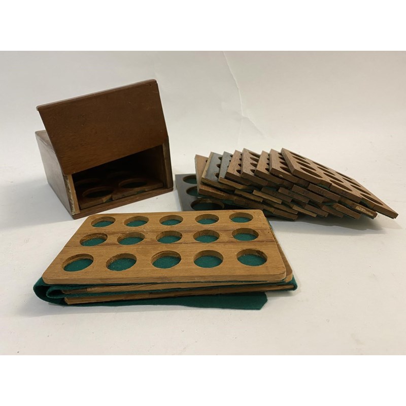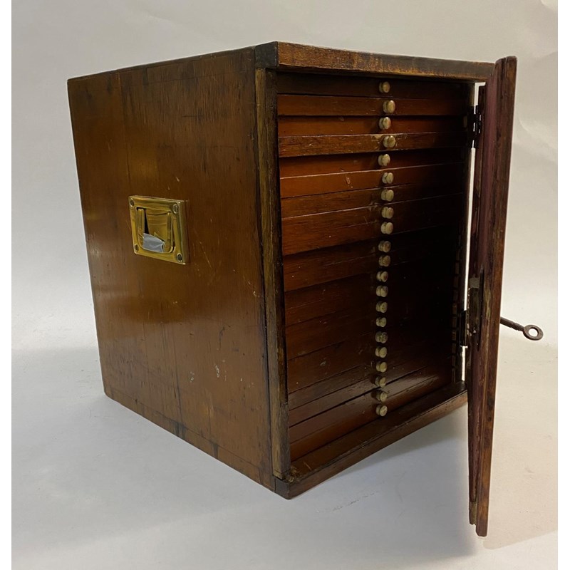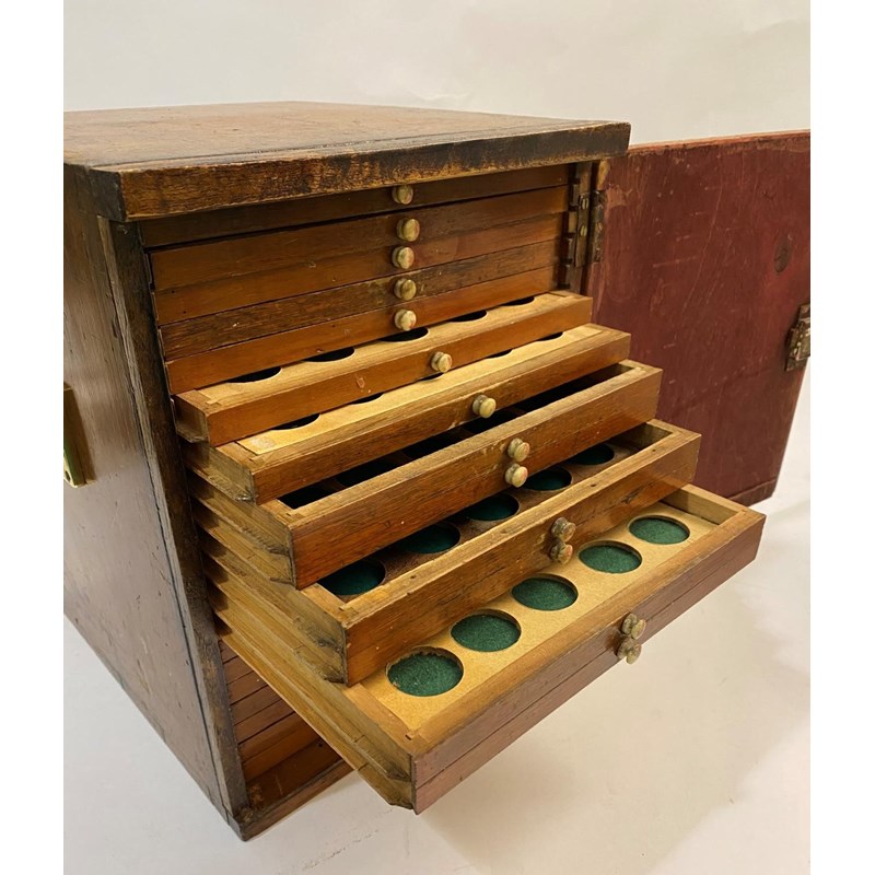 A single door coin collectors cabinet with seven single depth drawers and seven double depth drawers each modelled as two single drawers, with a key, 32cm high, 26.5cm wide and 30cm deep, and a small mahogany coin case with ten small trays, pierced for various sized coins, 8cm high 16.5cm wide and 13cm deep.