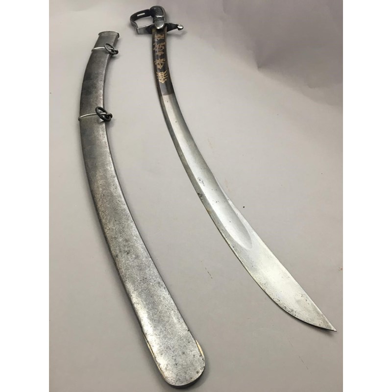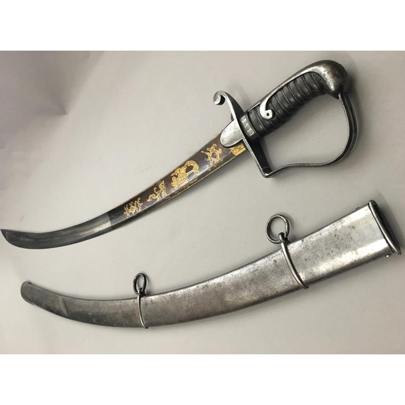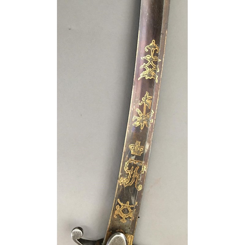 With an 83.5cm curved, fullered, broad blade with gilt decoration against a blued ground decorated with a pre 1801 Royal coat of arms, crown above GR cypher and military trophies, the back marked for Runkel of Solingen, with plain langlets, wire bound ebony handle and decorative steel back strap, with a steel scabbard with twin ring suspension, 96cm overall,