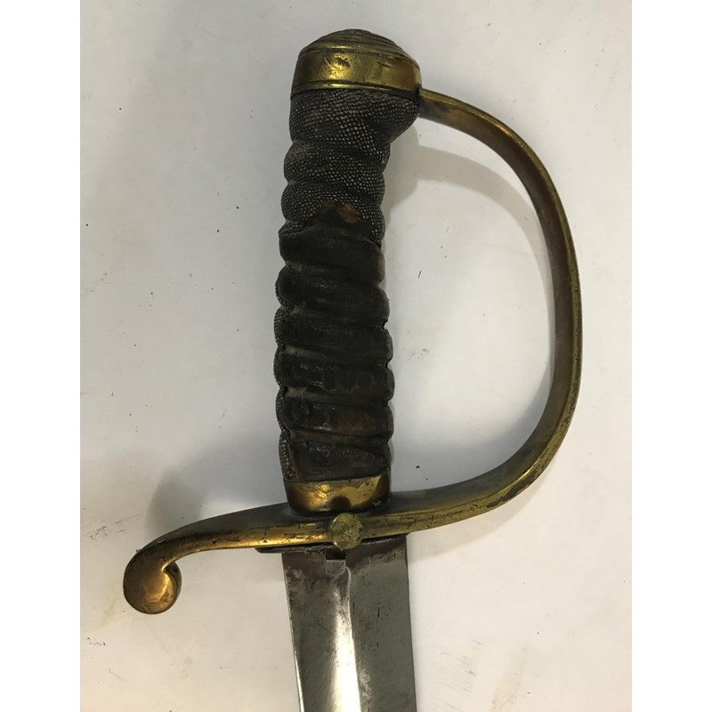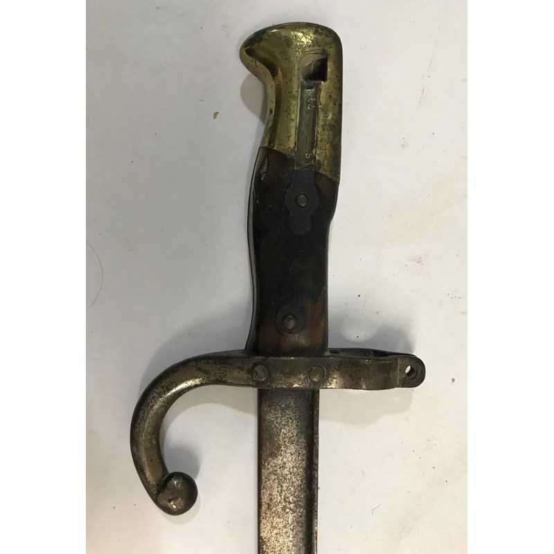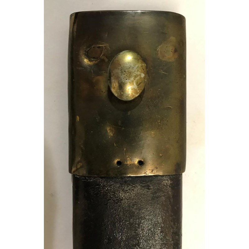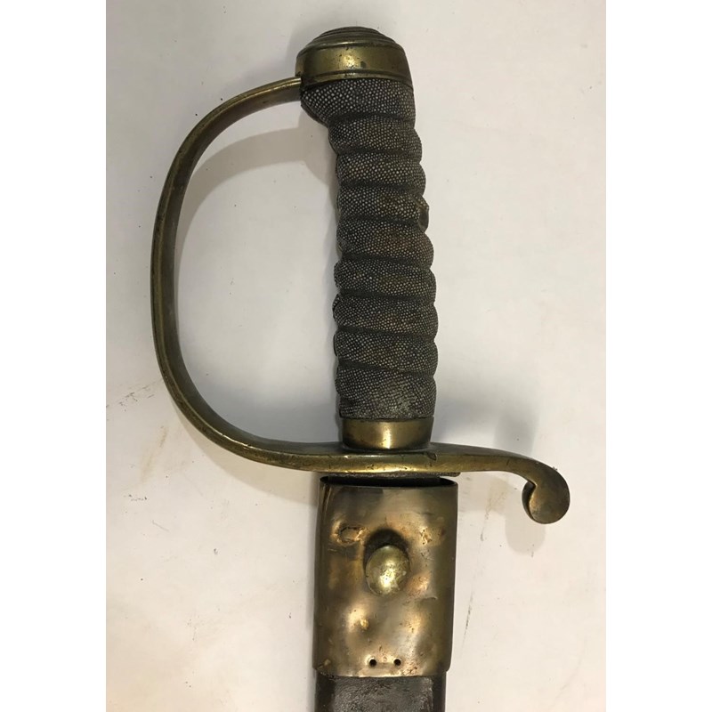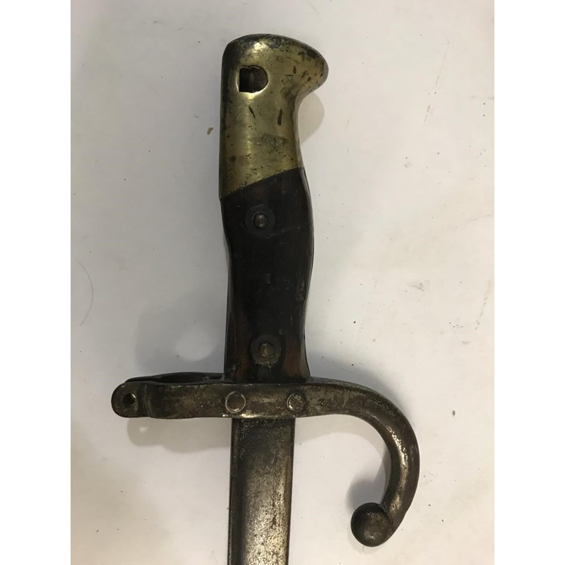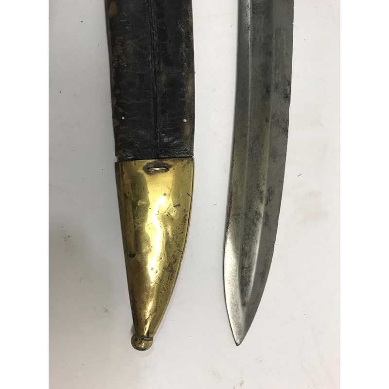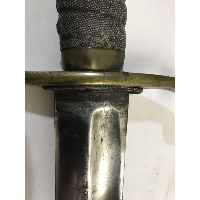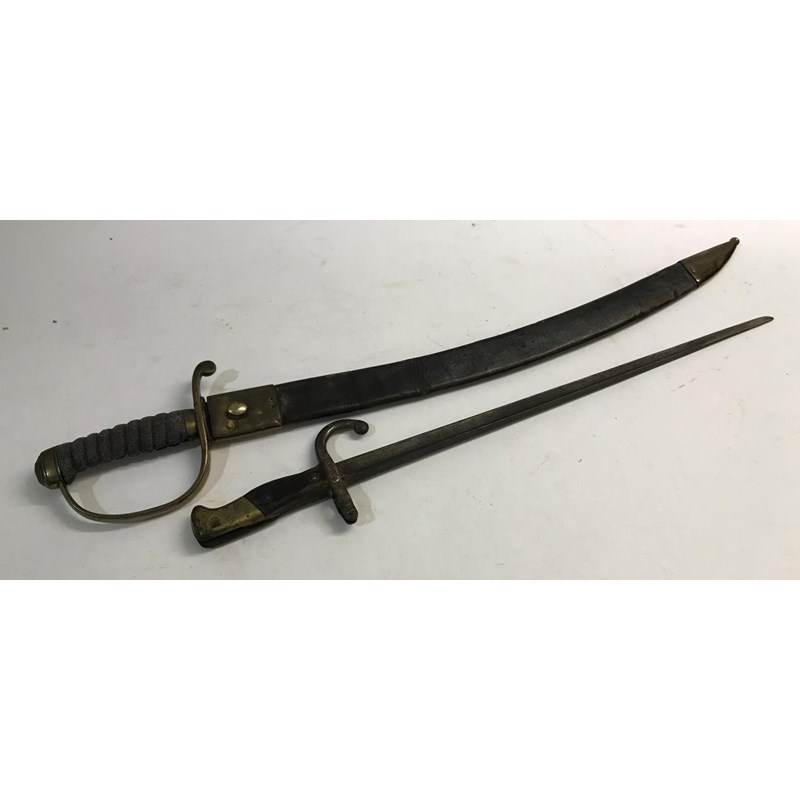 The sword with a 60cm curved fullered flat backed blade with pointed end, double edged to the last 22cm  with a shagreen covered grip (partially remaining) within a single bow guard with stepped oval pommel and quillon, with push button scabbard release, Marked HC 151. The leather scabbard with brass mounts, 75cm overall. With a French bayonet lacking scabbard.