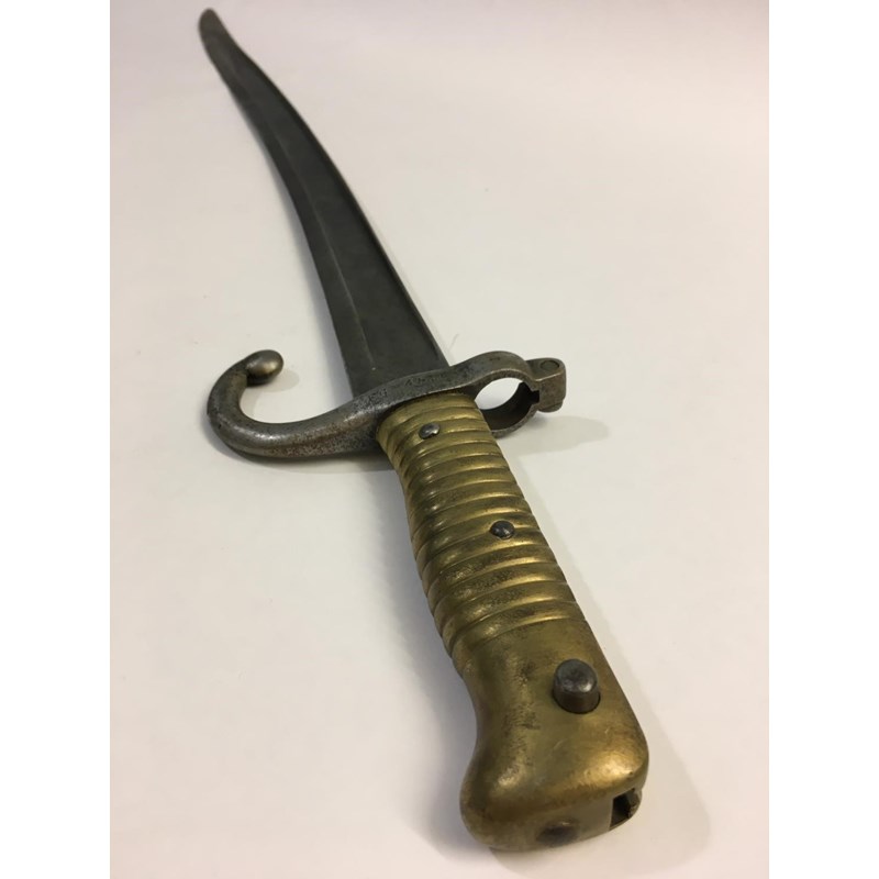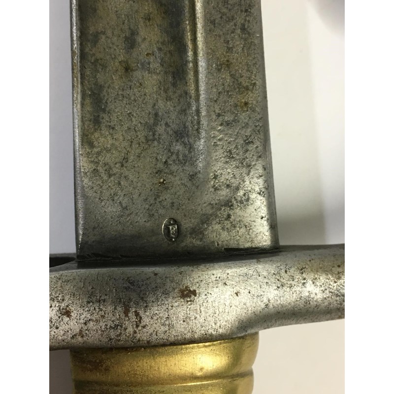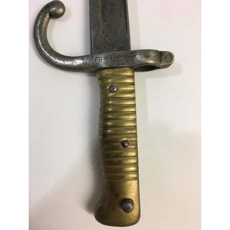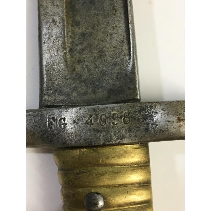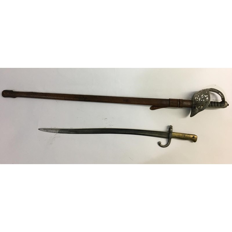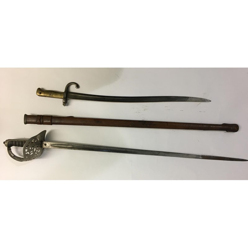 With an 82cm pointed blade with etched decoration and previous owners initials G.E.W. the blade marked for Henry Wilkinson Pall Mall, London, numbered 31215 to the back and 54 to the lower edge. With a wire bound fish skin grip and three quarter guard, with leather covered service scabbard, 100cm overall, the number suggests a date of 1892, possibly the fifth sword manufactured that year. With a French sword bayonet with curved blade and numbered FG4698, 69cm overall.