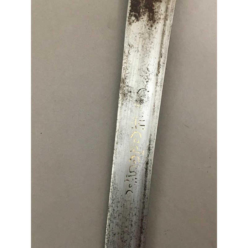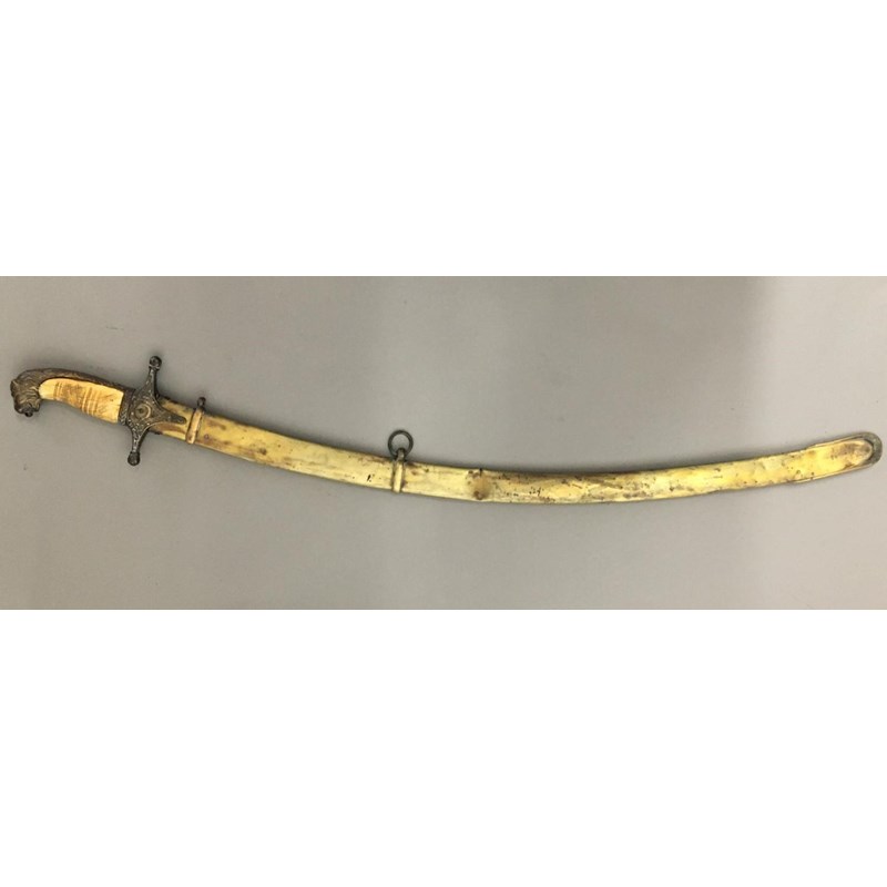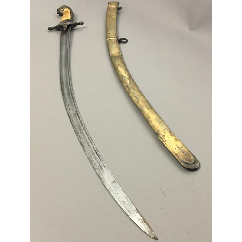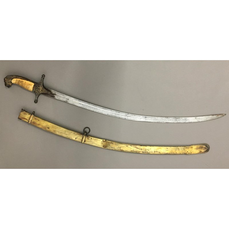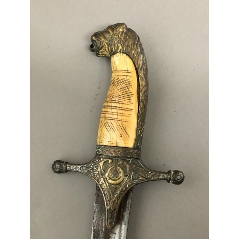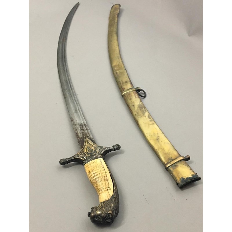The 67cm curved and fullered blade with a sharpened edge and engraved Turkish script, the cross bar with stylised crescent moon, ivory grip with engraved cross hatching and lions head pommel, in a brass scabbard 82cm overall.