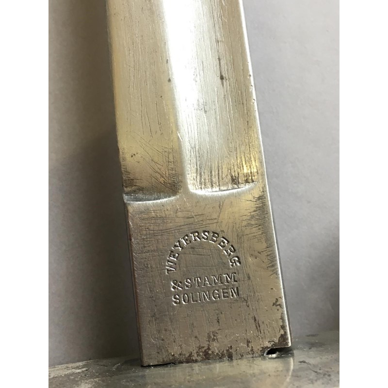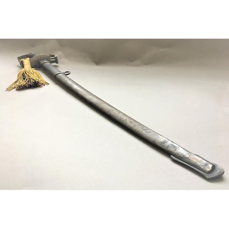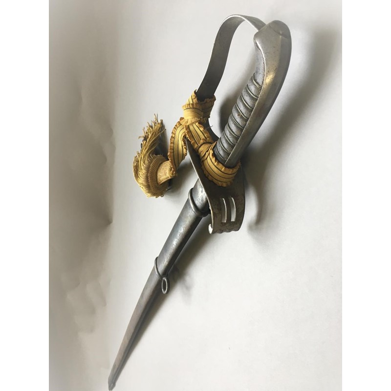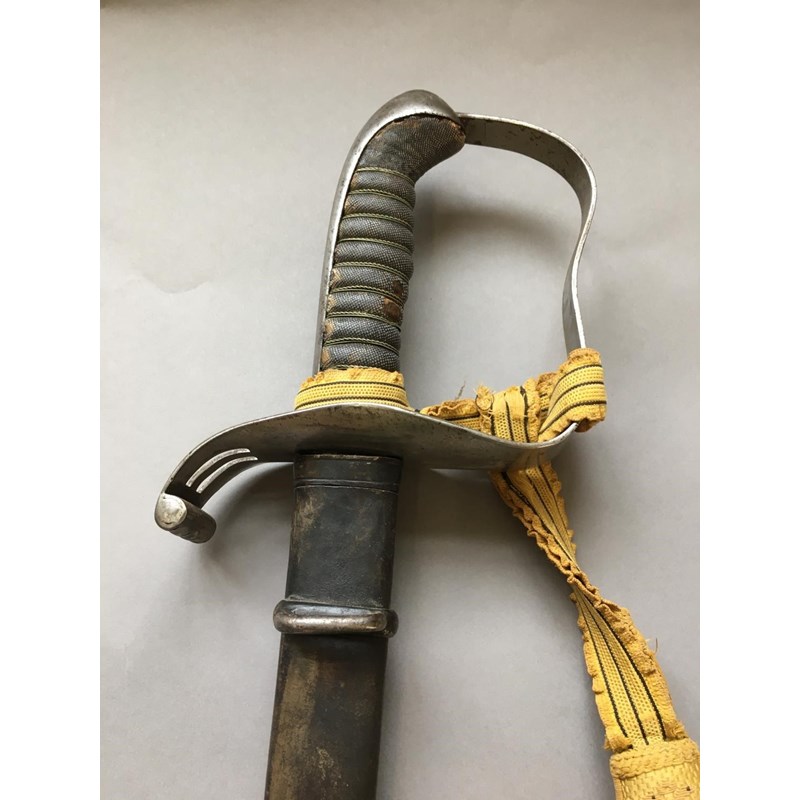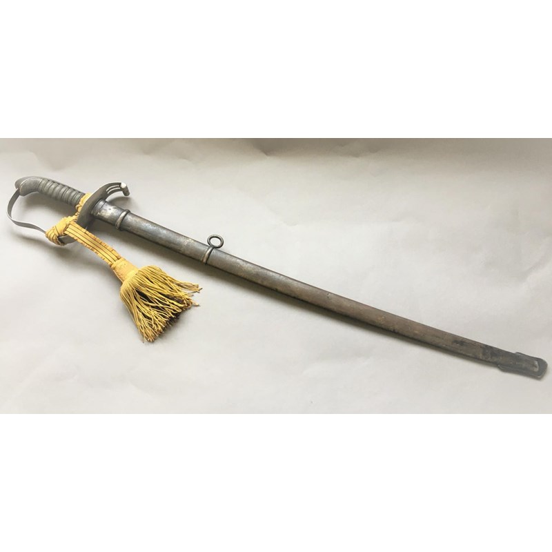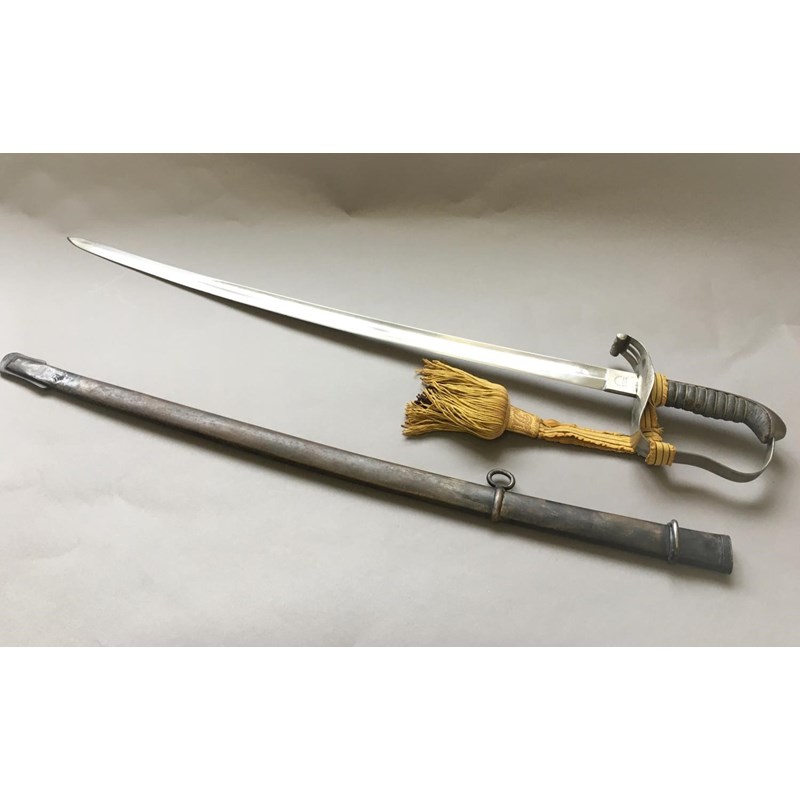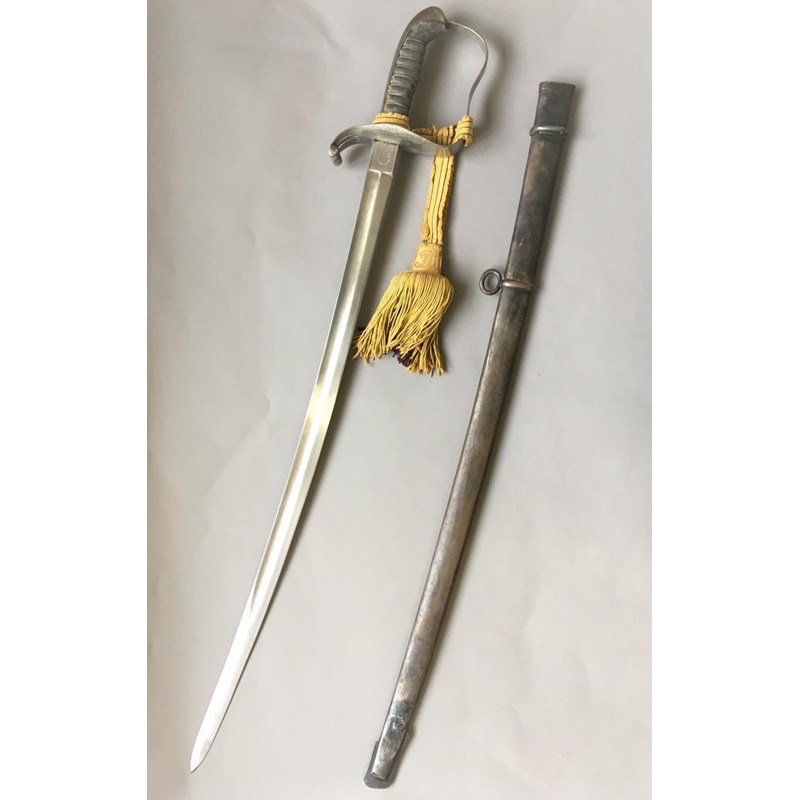Probably an 1861 Pattern Mountain Troops sword with a 70cm slightly curved fullered blade with sharpened edge, the blade marked 'Buchler & Rausnitz Budapest to one side and Weyersberg & Stamm Solingen to the other, with a strap guard, wire bound grip and rounded pommel, with a gold and blue sword knot with elaborate tassel, in a steel scabbard with single ring suspension. 89cm overall.