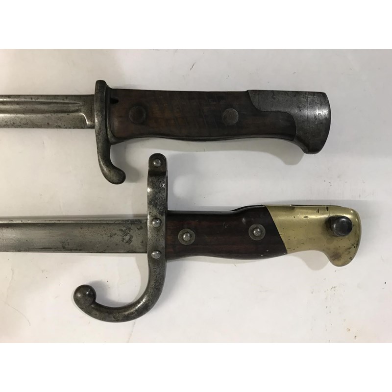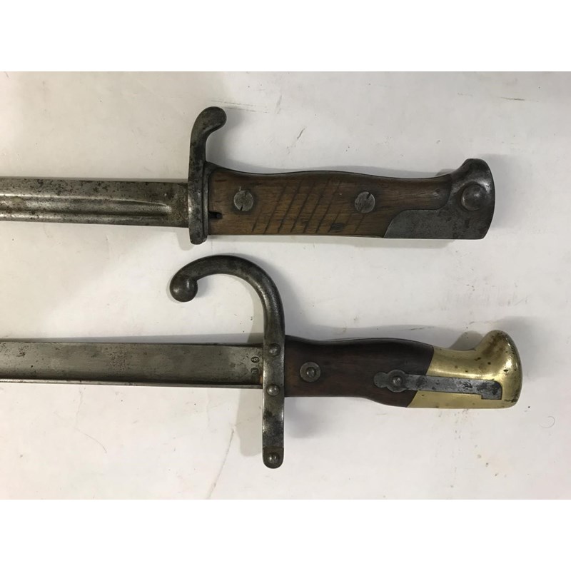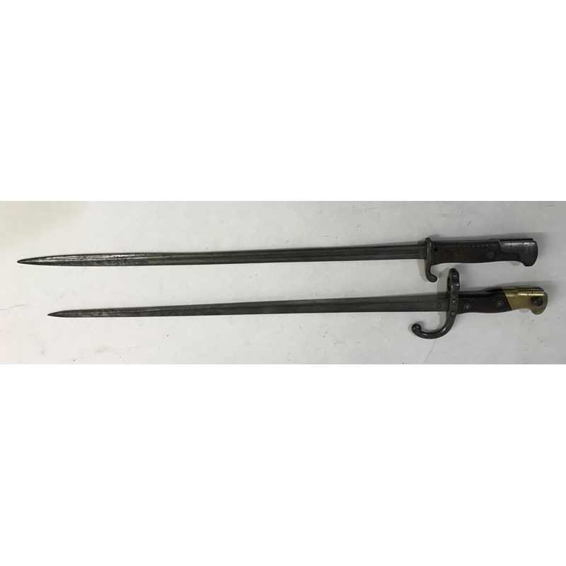 An M1898 bayonet with a 52cm fuller and pipe backed blade, stamped 117R to the cross bar, with two part wooden handle, 65cm and a similar French Chassepot type bayonet dated 188_ 65cm. Both lacking scabbards. (2)