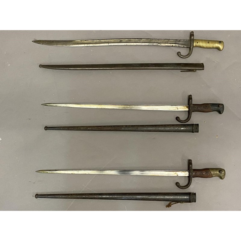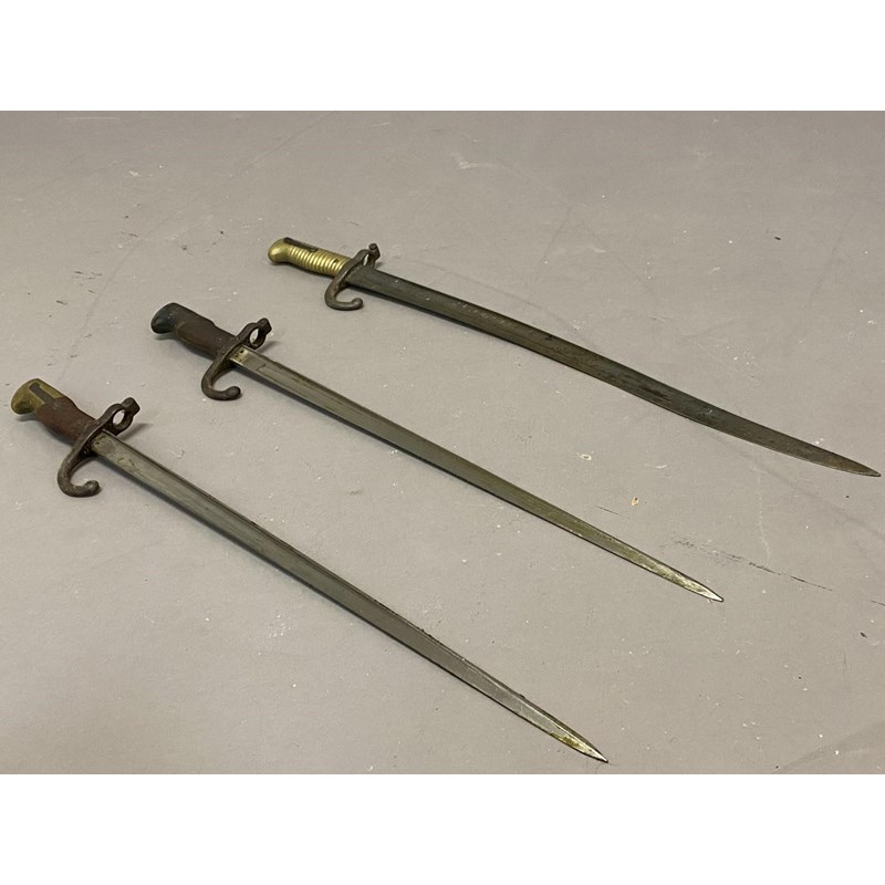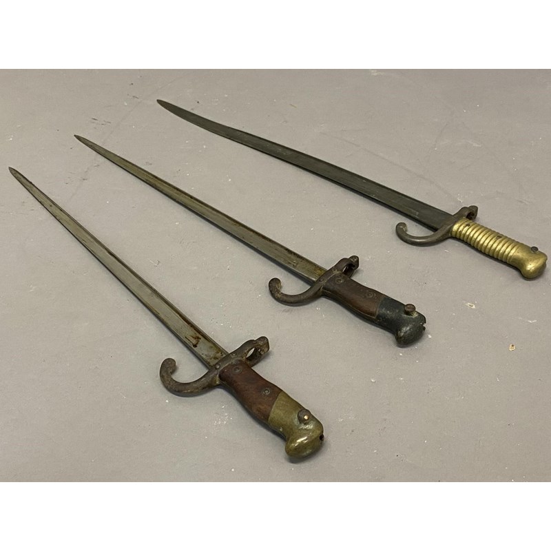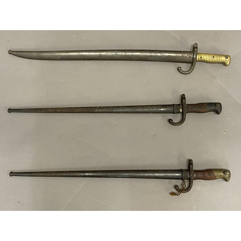 THREE SIMILAR FRENCH SWORD BAYONETS AND SCABBARDS.