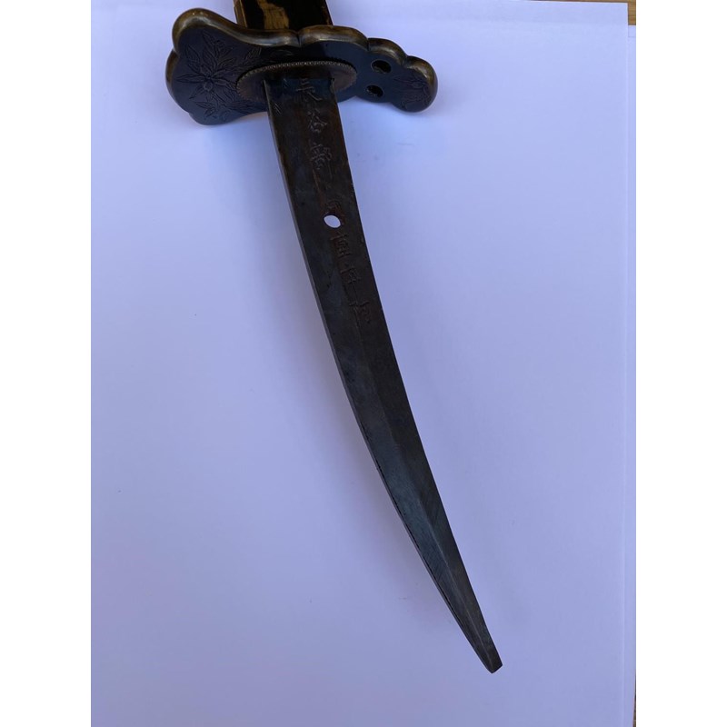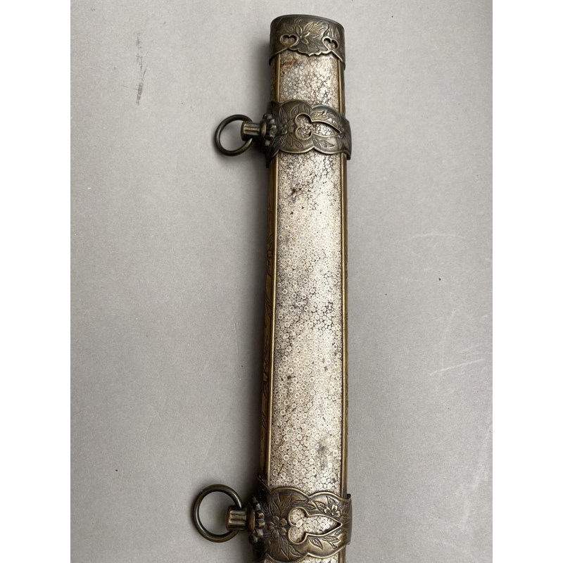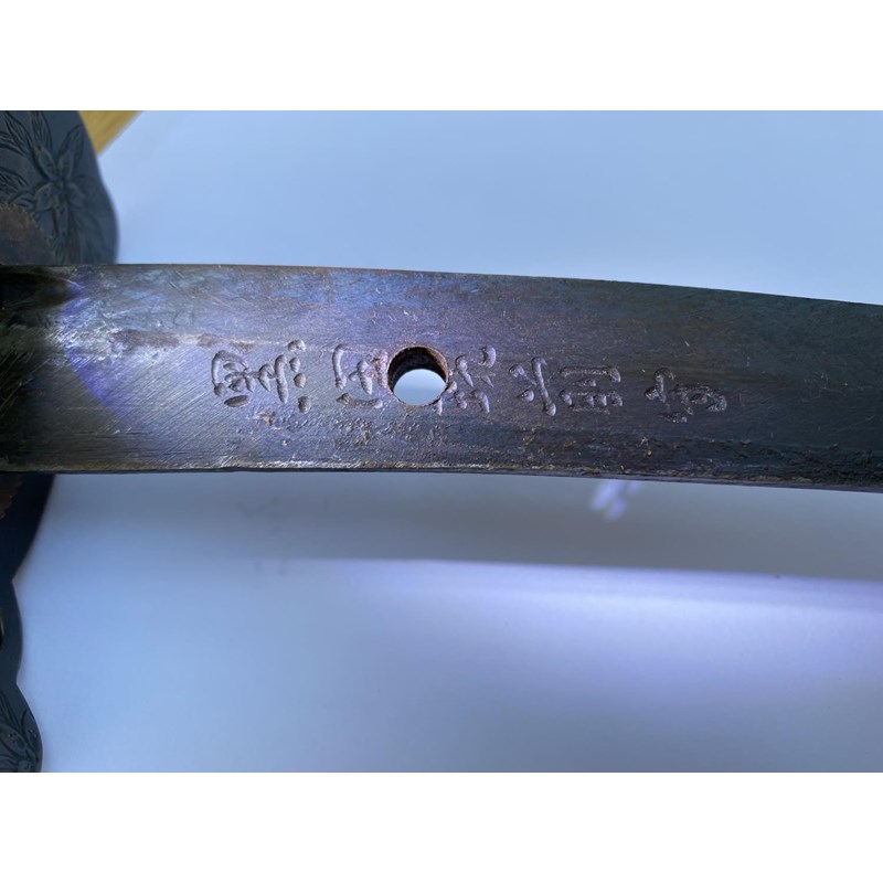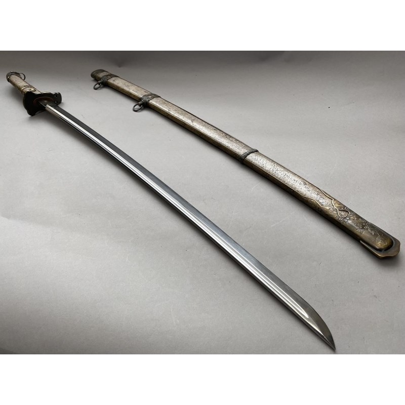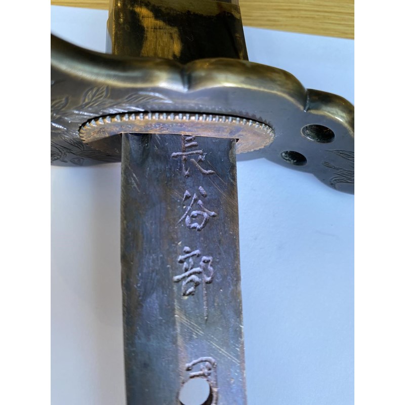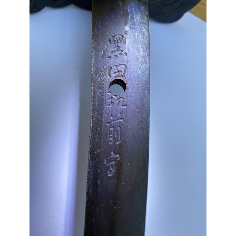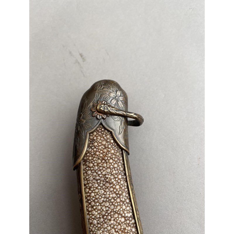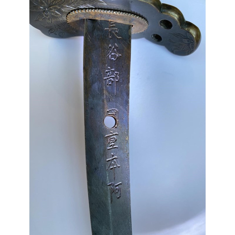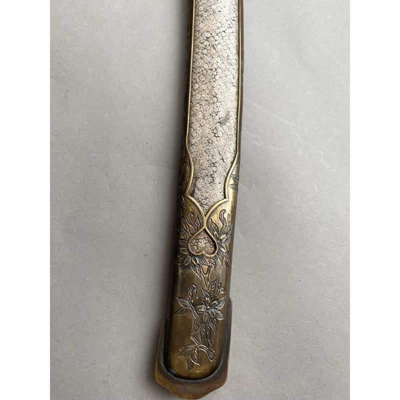 With a 73cm blade, the Tang reads: Hasebe Kunishige Roku O' which approximates to 60th in flattery of Hasebe Kunishieg, the other side reads: Kuroda Chikuzen no kami - Kuroda Lord of Chikuzen province. Tsuka and saya covered in Samegawa. With full length bronze fukurin embellished with repousse cherry decoration. Bronze fittings engraved in relief with further cherry blossom and leaves.