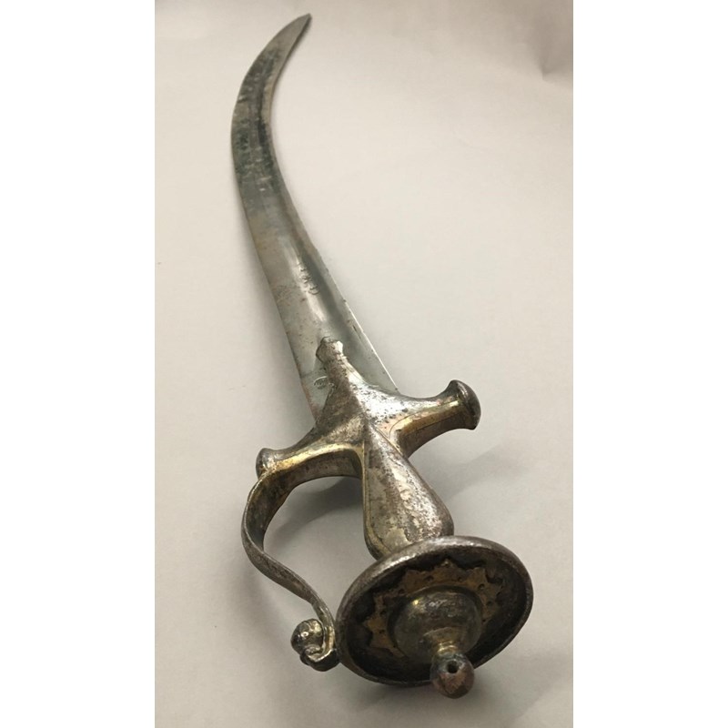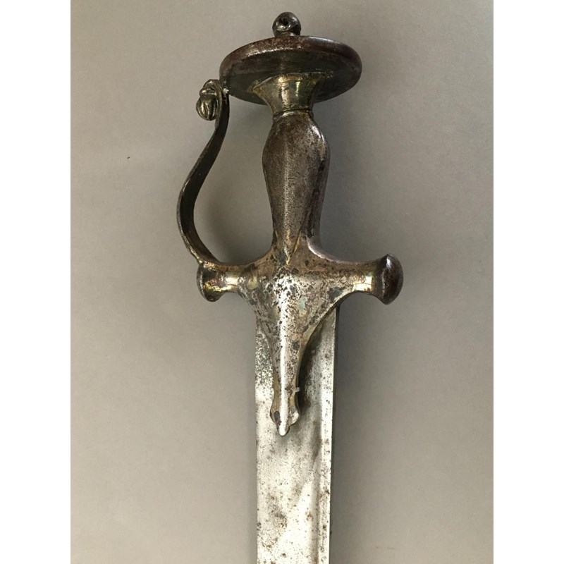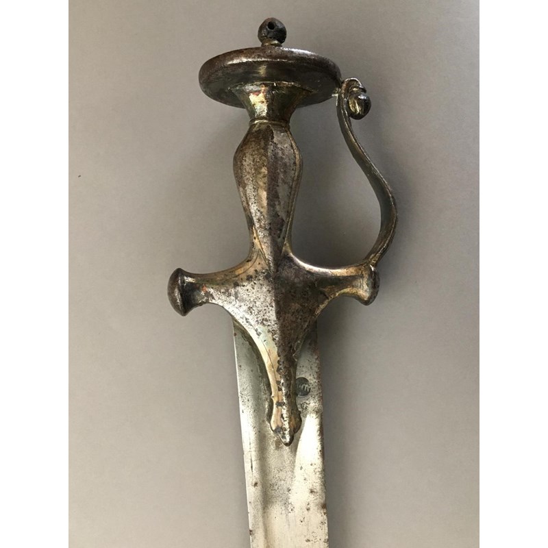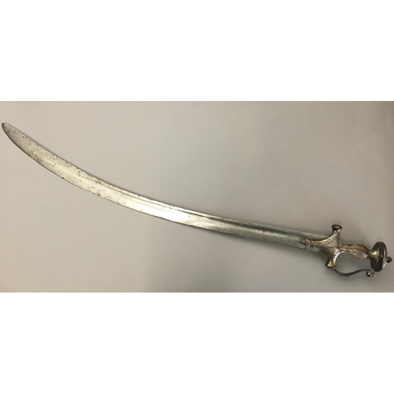 With a 78cm curved and fullered blade with sharpened edge, with stamped decoration to the blade, with a silvered and partially gilt pommel with extended langets and pommel hilt, 92cm long.