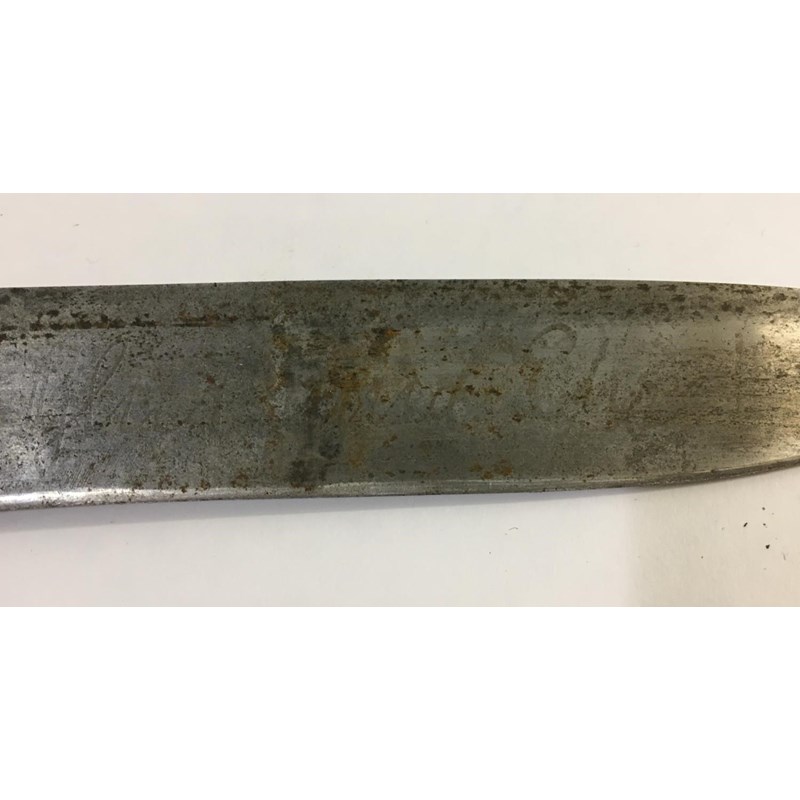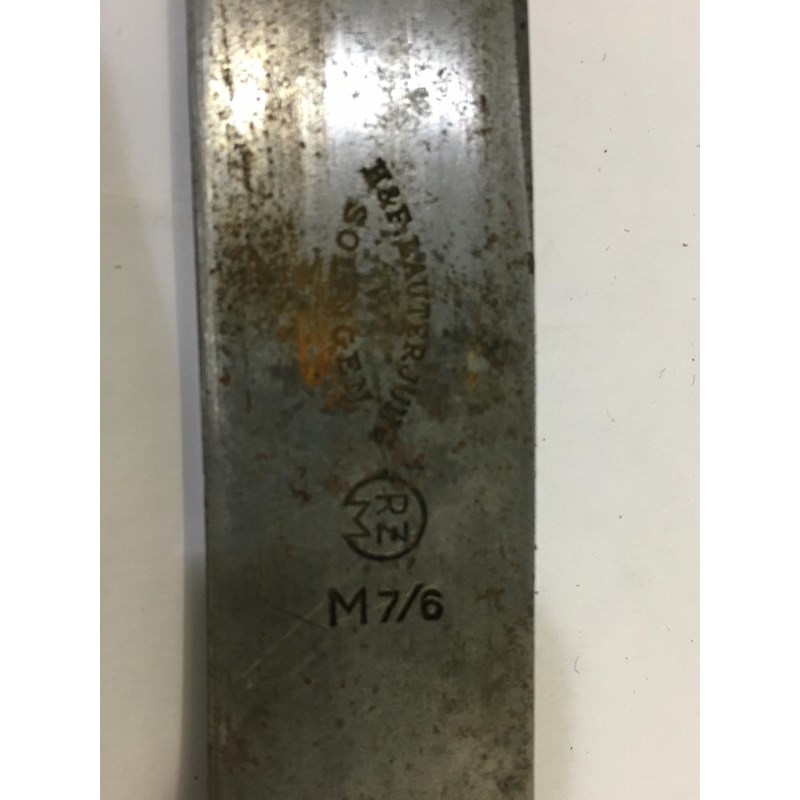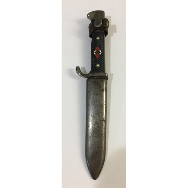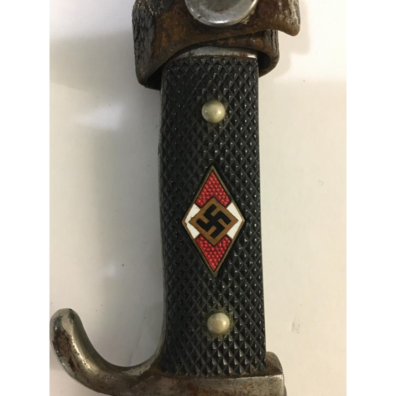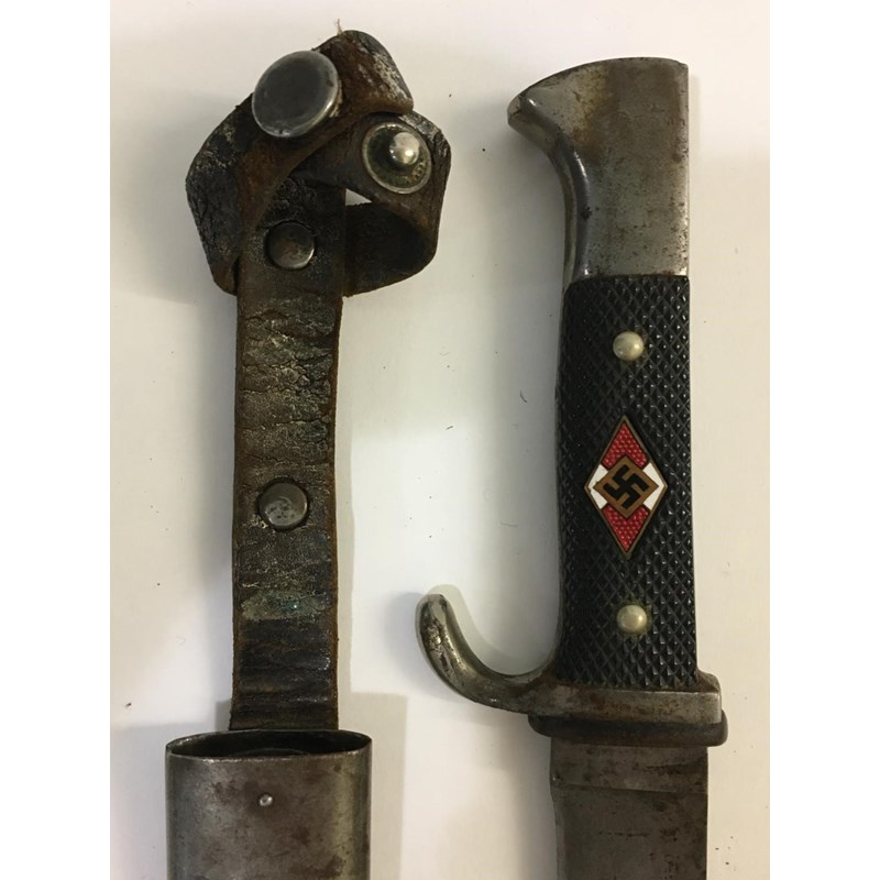 With a 13.5cm sharpened pointed blade with motto 'Blut Und Ehre' (Blood and Honour), the other side with RZM M 7/6, H&F Lauterjung, Solingen, with checkered grip and Hitler Youth diamond, with iriginal scabbard. 25.5cm overall.