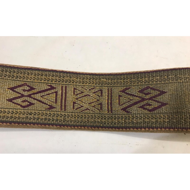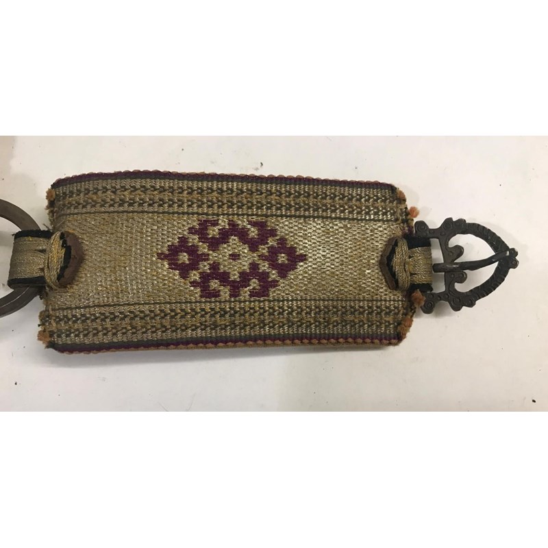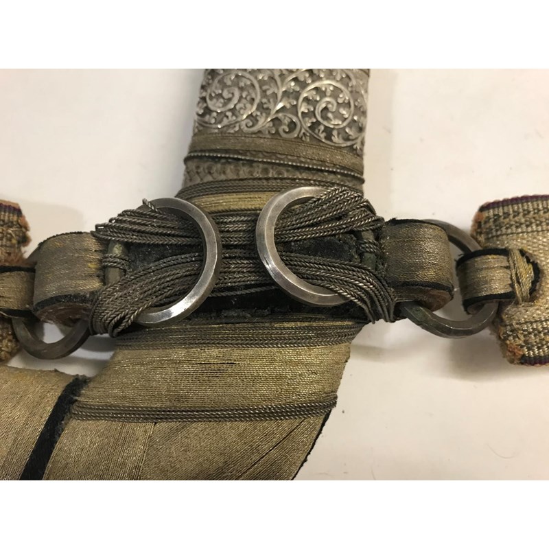 The dagger with a 16cm curved centrally ribbed blade on a silver mounted horn handle, the scabbard with similar foliate metal mounts and bound 'silver' wire decoration, on an elaborate woven fabric belt with decorative bound wire and ring mounts.