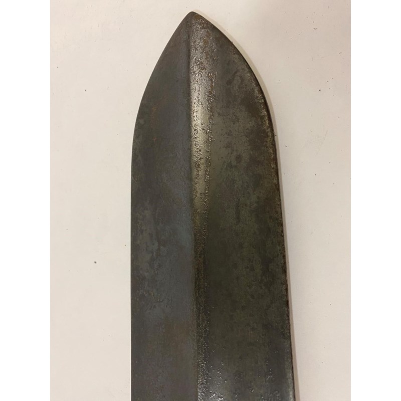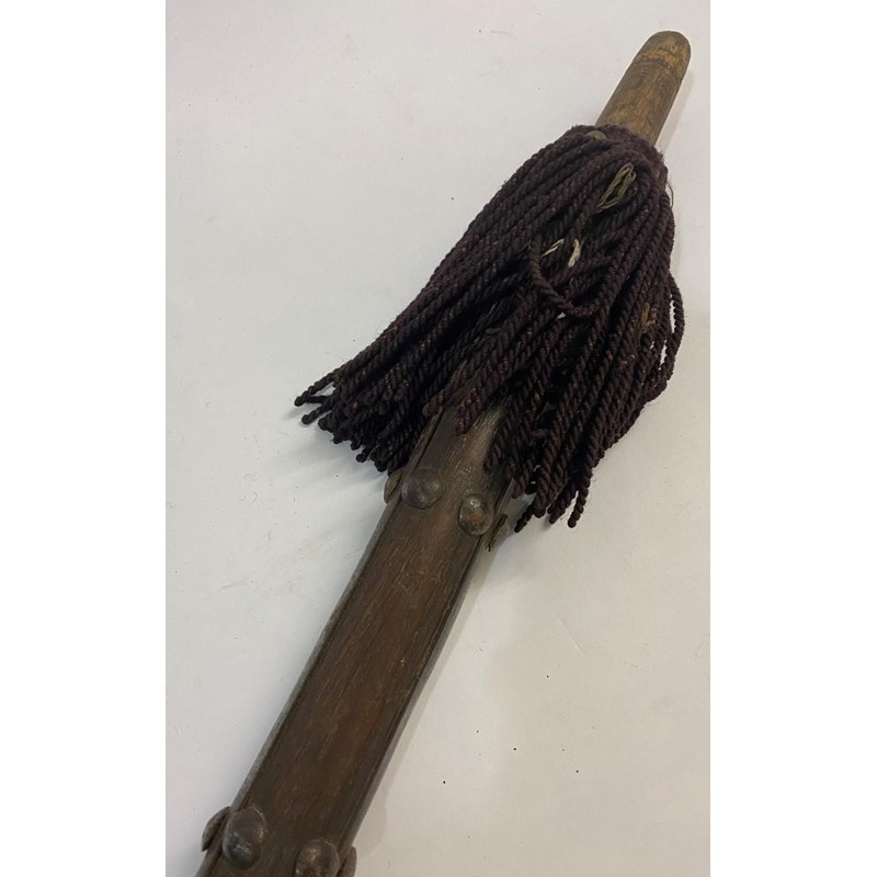 With a pointed sword like blade spreading to a broad base with engraved scrolling decoration, on a tapering socket mount, on a long pole with steel mounted end with tassels, the top 58 x 17cm, 228cm overall.