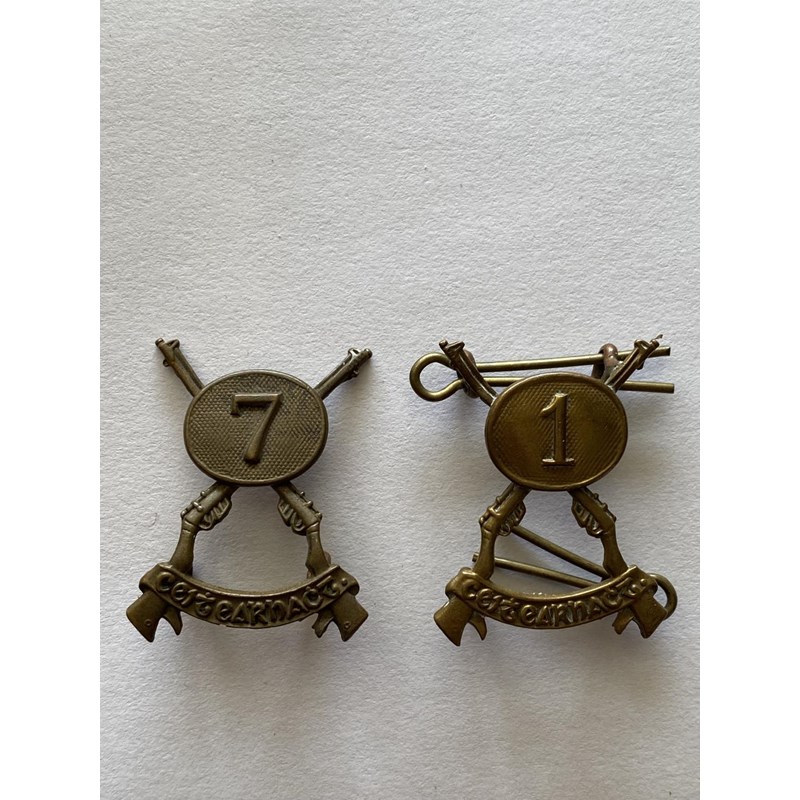 TWO EARLY POST 1924 IRISH REGIMENTAL COLLAR BADGES. Two similar Eire Infantry collar badges with crossed rifles and numbers 1 and 7.