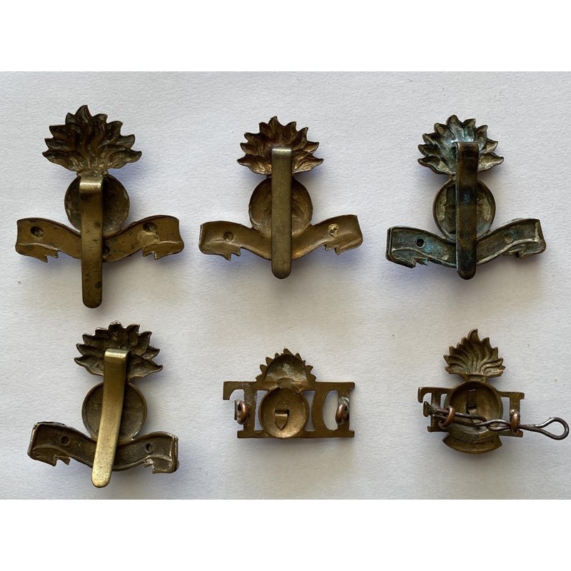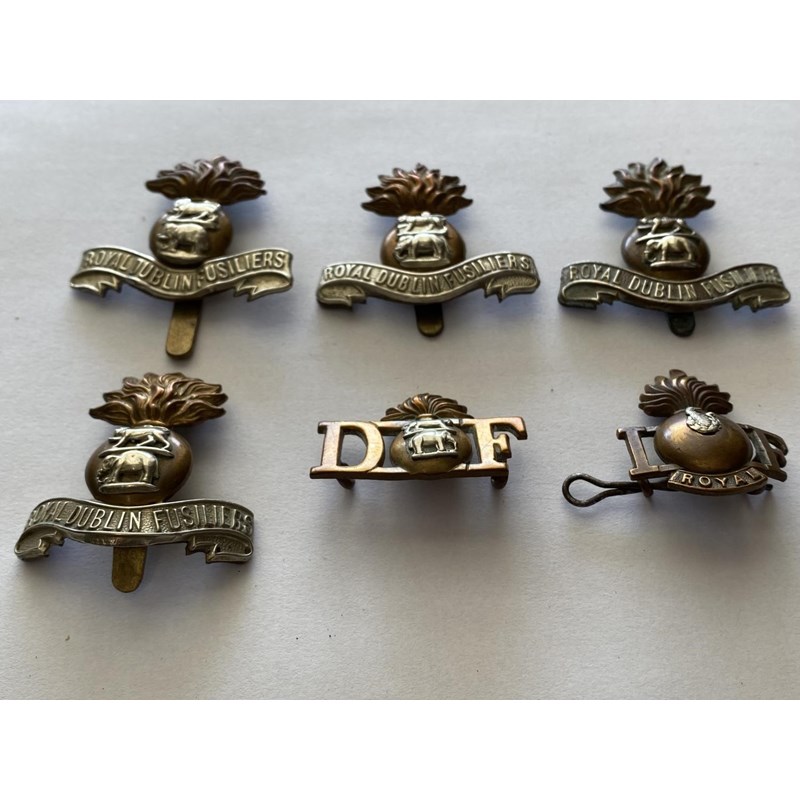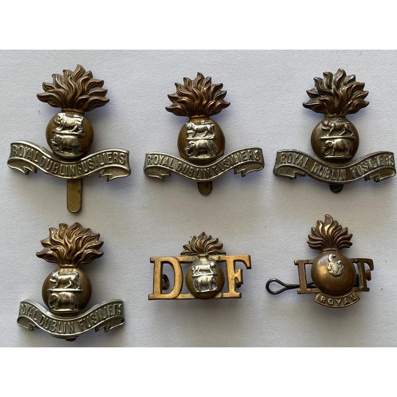 A COLLECTION OF SIX ROYAL DUBLIN FUSILIERS BADGES. Shoulder and cap badges of the Royal Dublin Fusiliers, various designs with elephant and leopard representing the Madras and Bombay Fusiliers that formed the regiment. (6)
