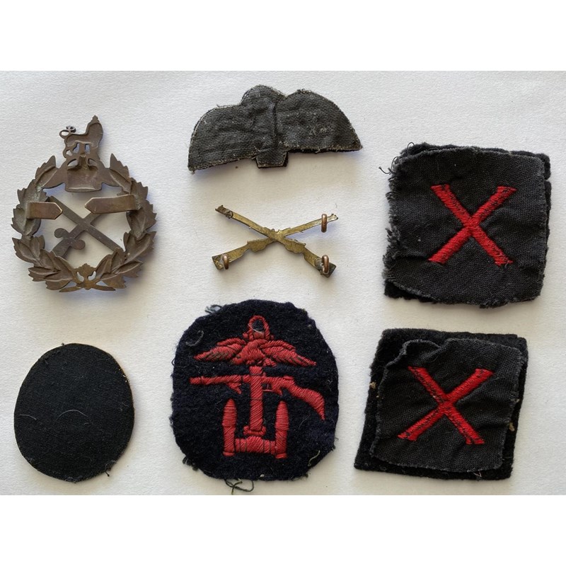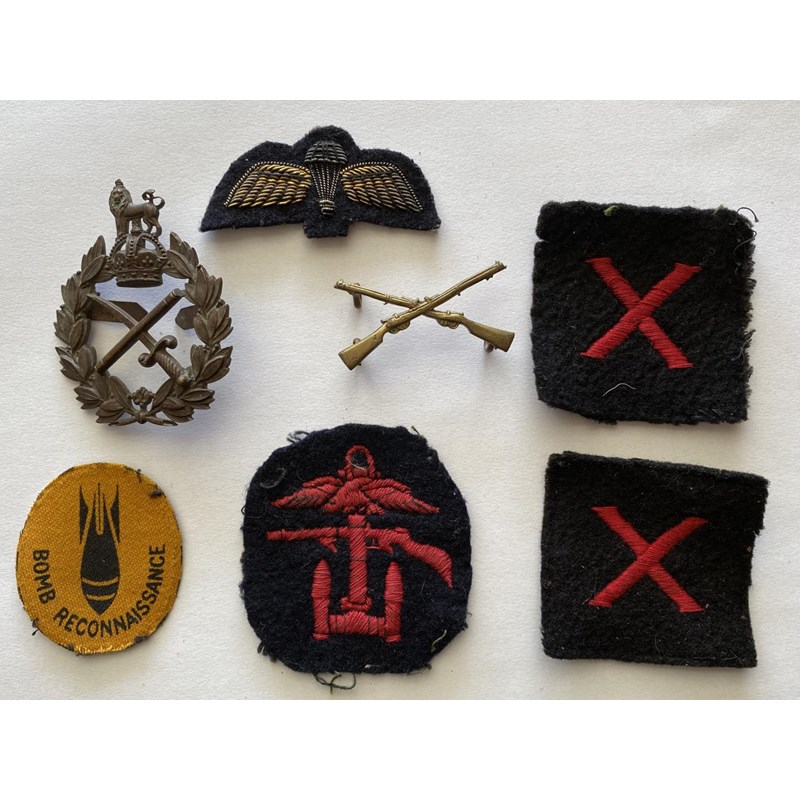 A STAFF OFFICERS CAP BADGE AND OTHERS. A cap bad with crossed baton and sword, a crossed rifles badge and five fabric patches including 'Bomb Reconnaissance' and others. (7)