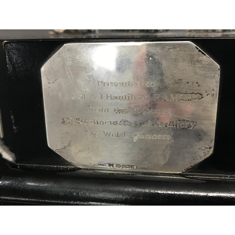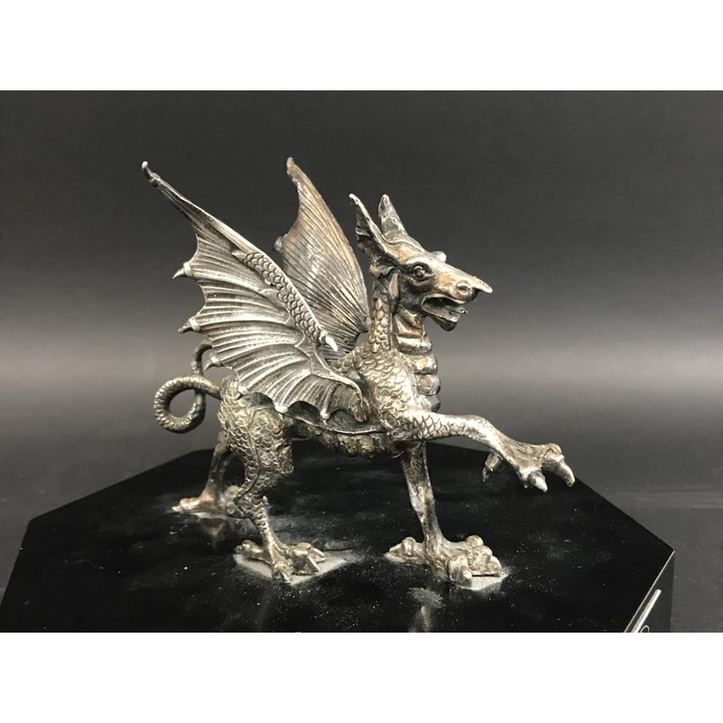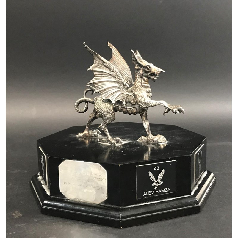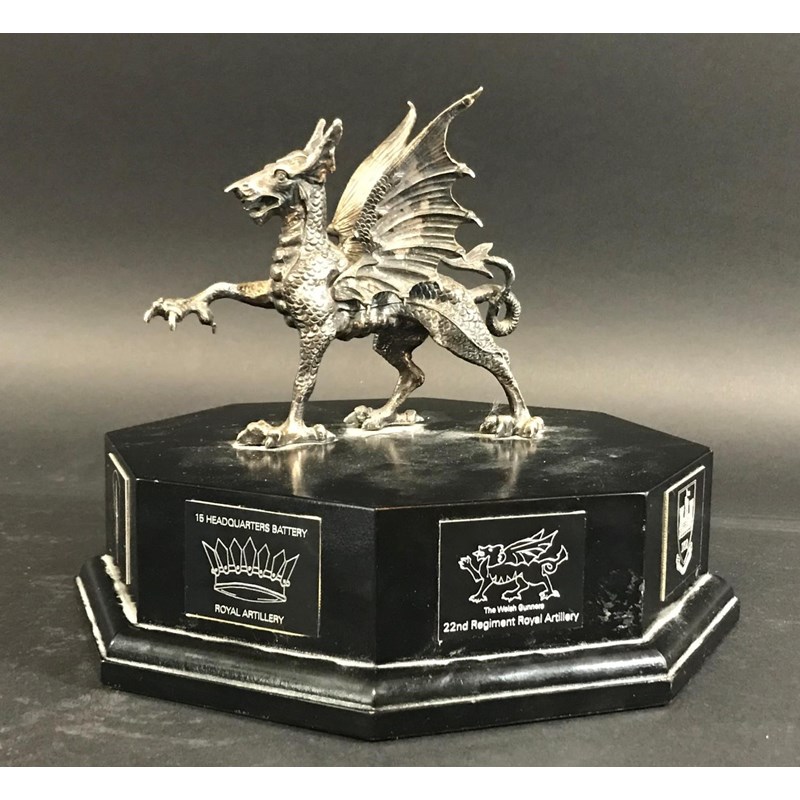 A presentation award with a Welsh dragon with wings raised and front leg in attacking pose, on an octagonal base with a silver presentation plaque 'Presented to Lt Col A.J. Hamilton RAMC(V) From the Officers 22 Regiment Royal Artillery the Welsh Gunners' hallmarked for Sheffield 2000. 25cm wide, 20cm tall.