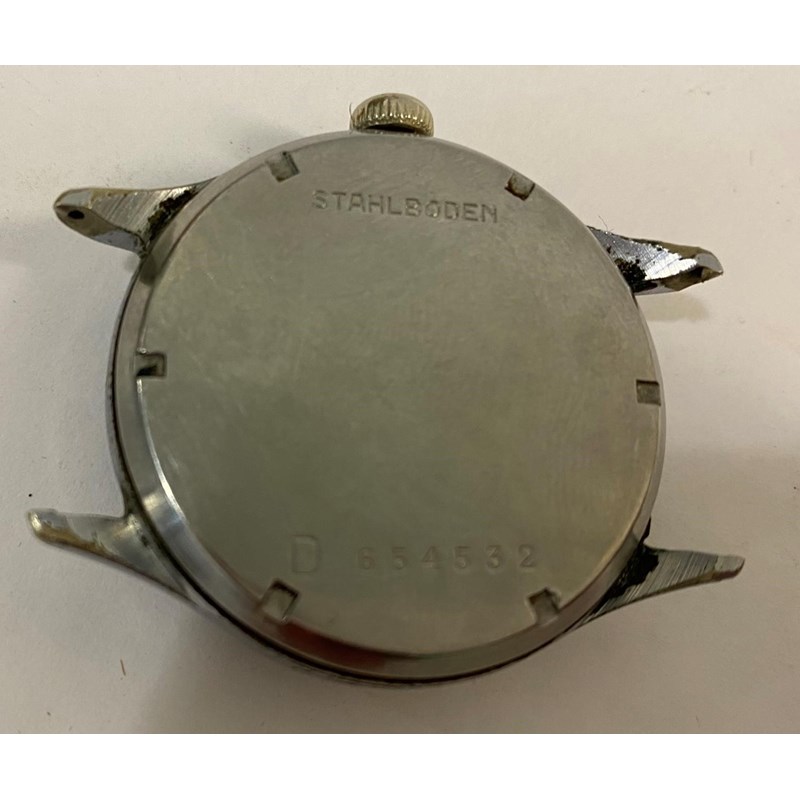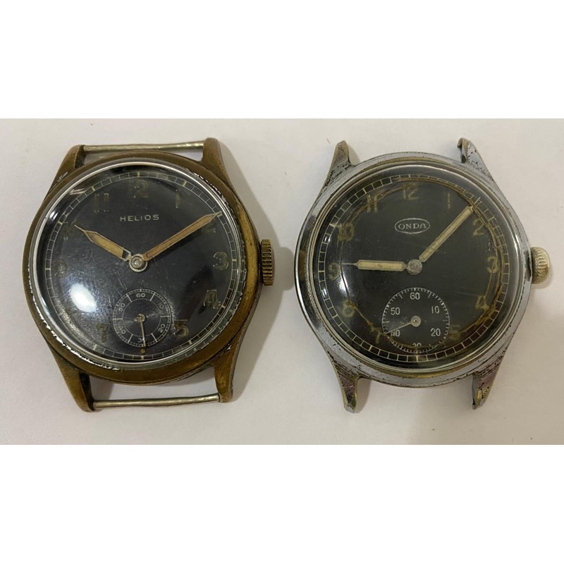 A German military wristwatch by Helios with black dial with subsidiary seconds dial, stamped to the reverse 'Stahl Boden Wasserdicht' 'D14522H' possibly denoting Airforce issue and similar Onda watch stamped 'Stahlboden D654532' possibly for Army issue, 33mm diameter. (2)