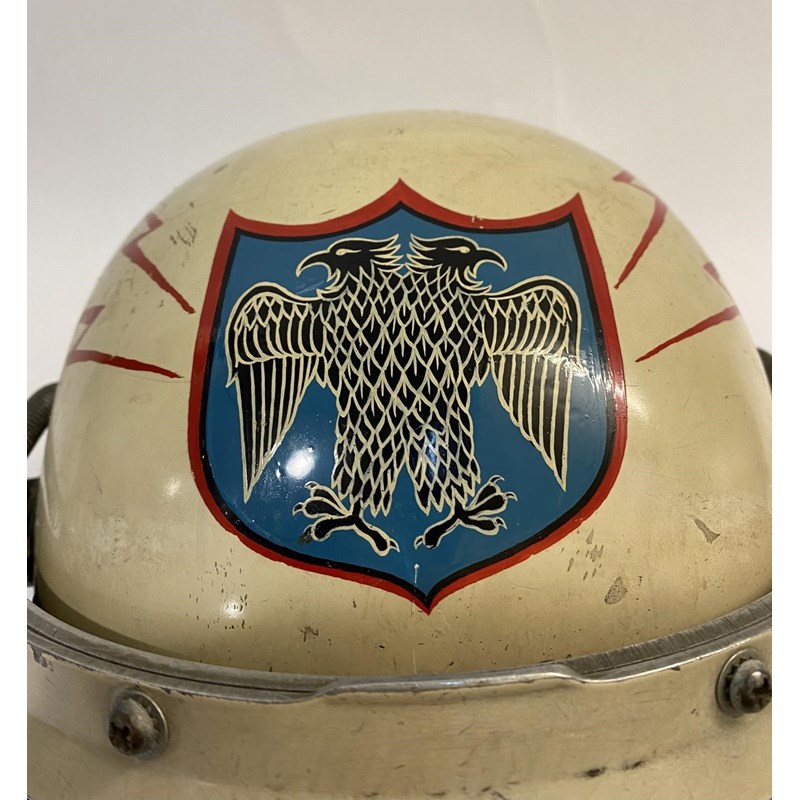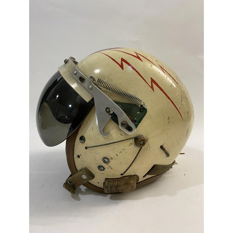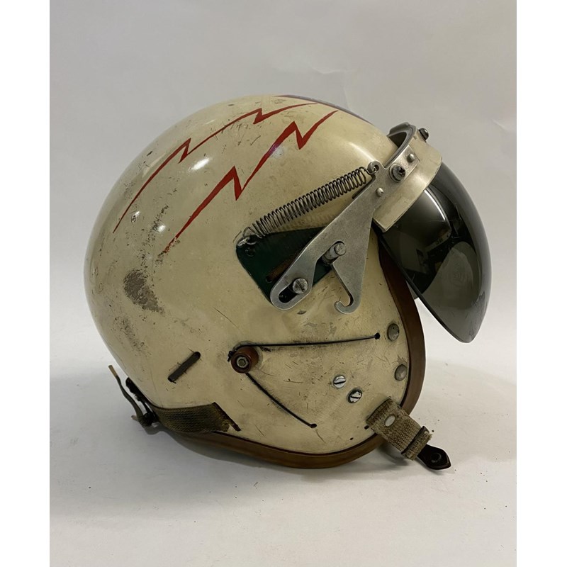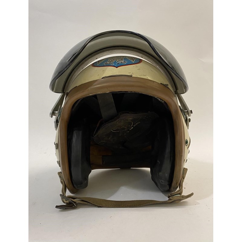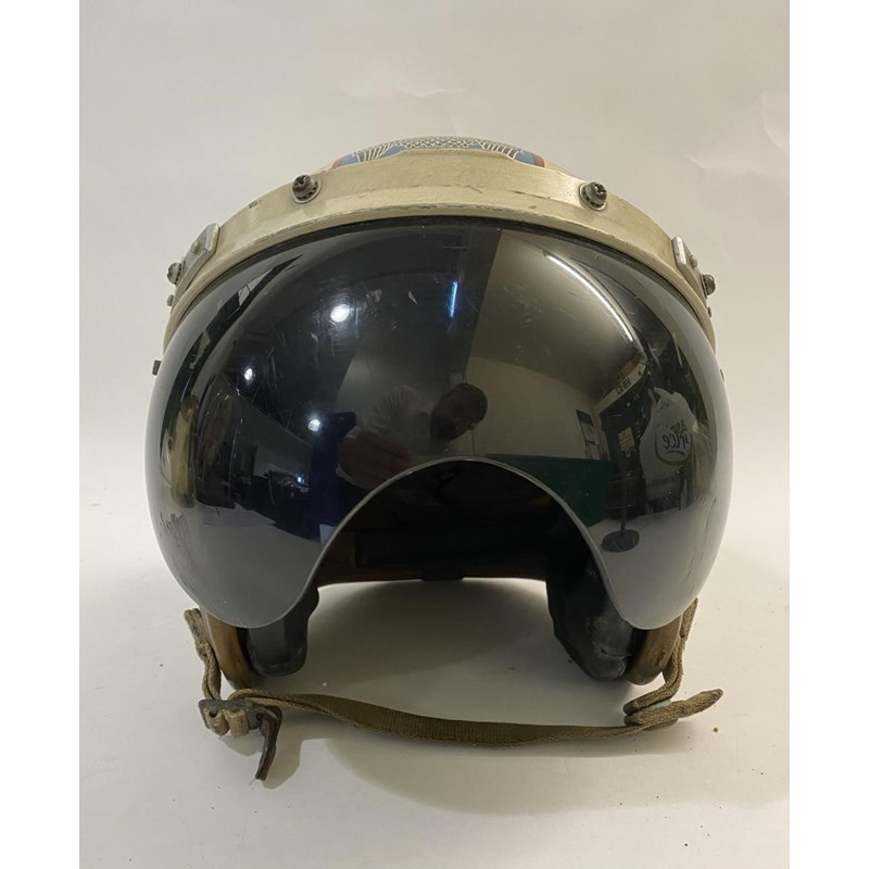 A mid 10th century U.S. Airforce helmet, the outer shell painted with a two headed eagle against a blue ground with lightening bolts radiating from the shield, with two position tinted visor with fabric visor cover, the interior with full liner marked U.S. Airforce, in used condition.
