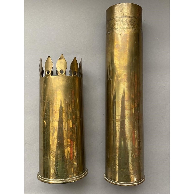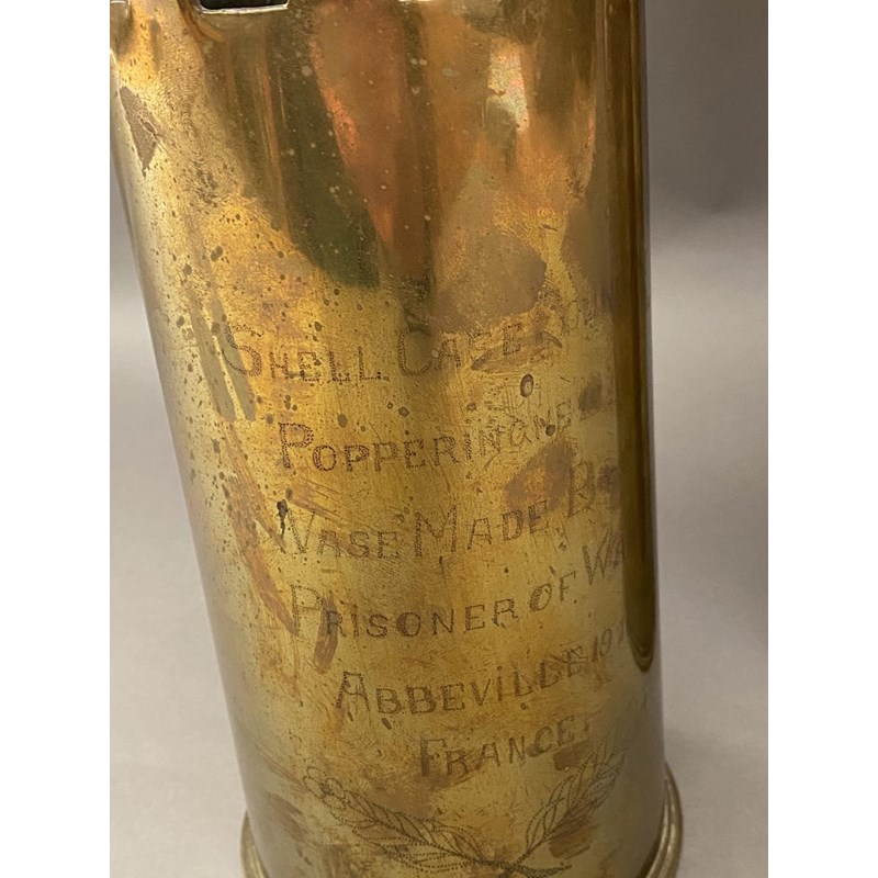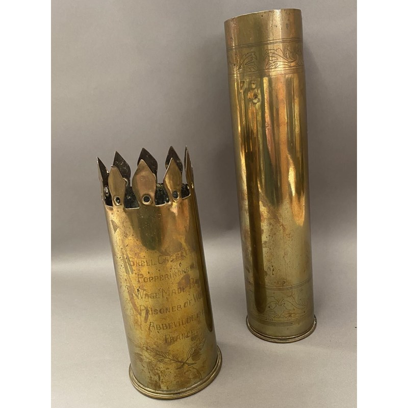 A brass shell case with decorative pierced and shaped rim with 'pricked' inscription to the front, 'Shell Case Found at Popperinghe 1916 Vase Made by Prisoner of War Abbeville 1919 France' the shell marked 18 P and 3/16 amongst other marks, 24cm tall and a similar shell case with decorative borders, 35cm tall.