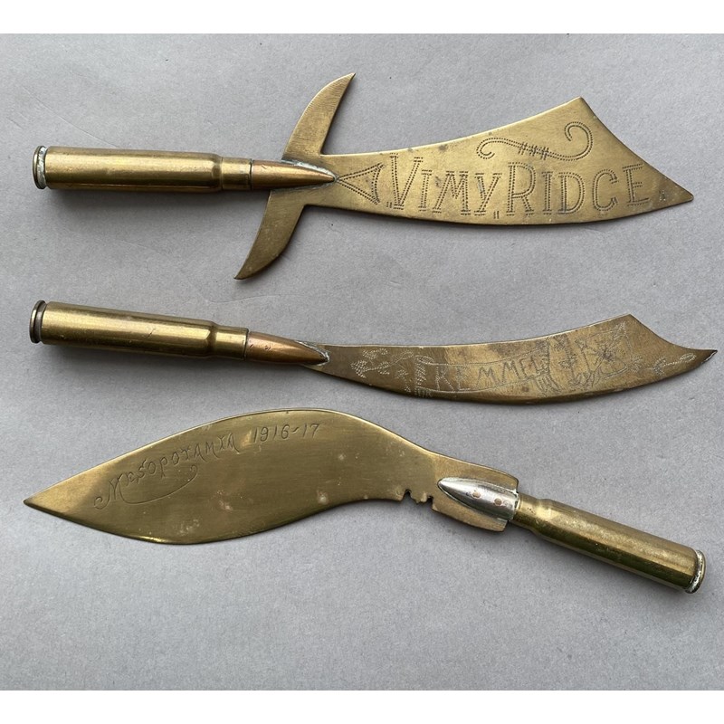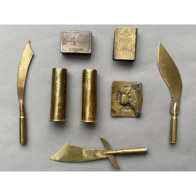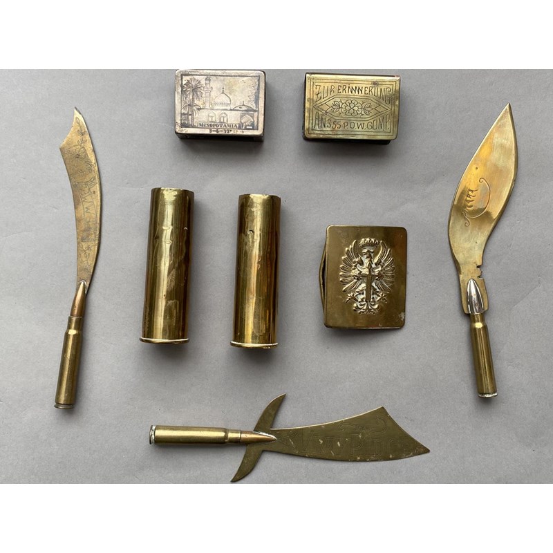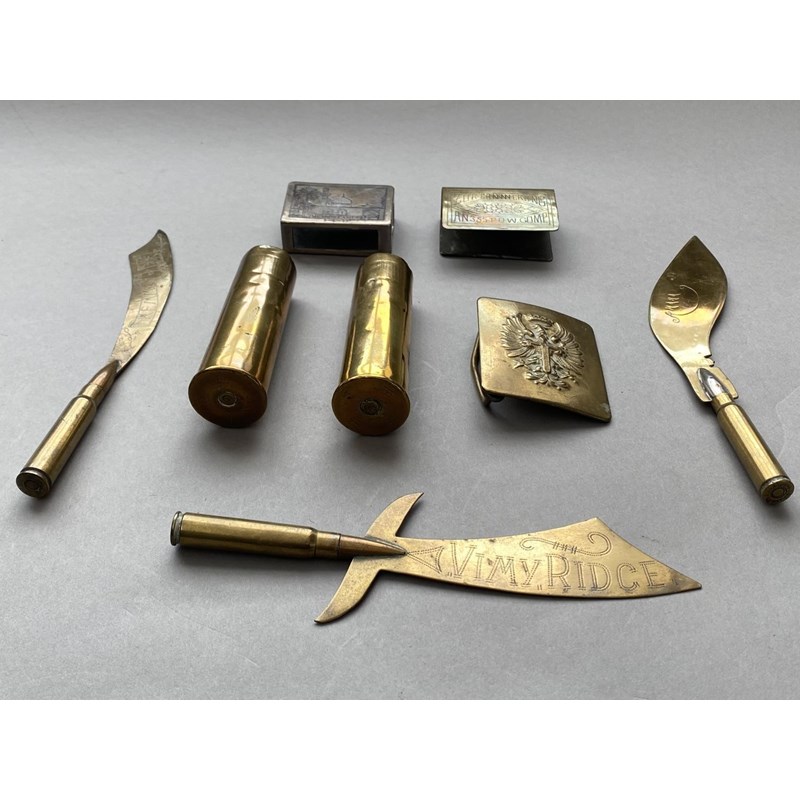 Three trench art letter openers with bullet handles and shaped blades, engraved 'Kemmel' 'Mesopotamia 1916-17' and 'Vimy Ridge' 19cm and smaller. two shell cases dated 1898 and 1899 9cm tall, 3cm wide, a Spanish brass belt buckle marked 'Cereceda', a matchbox cover dated 3-4-17 'Mesopotamia' with Niello style decoration and another 'Zurer Erung An355 P.O.W. Comp' and 'Le Havre'. 8 items.