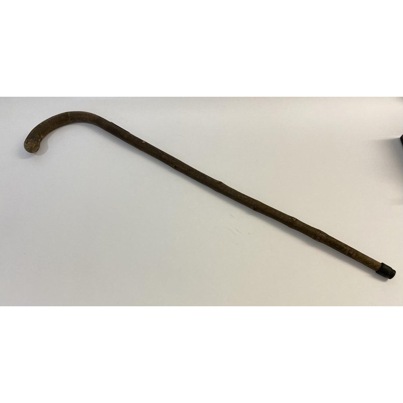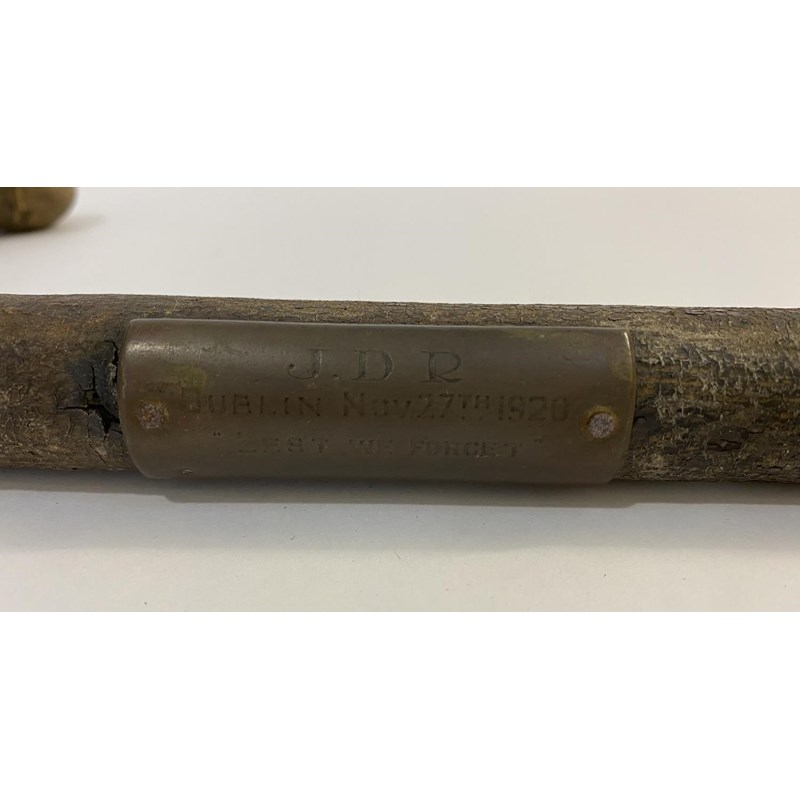 A rustic wooden walking stick with broad curving handle, probably Ash retaining the bark, with an attached brass plaque 'J.D.R. Dublin Nov 27th 1920 Lest we forget', 94cm. 'Bloody Sunday' on 21st November 1920, was a day when more than thirty people were killed or fatally wounded during the Irish War of Independence. It is possible that the inscription on this walking stick relates to one of those who died fighting in the War of Independence.