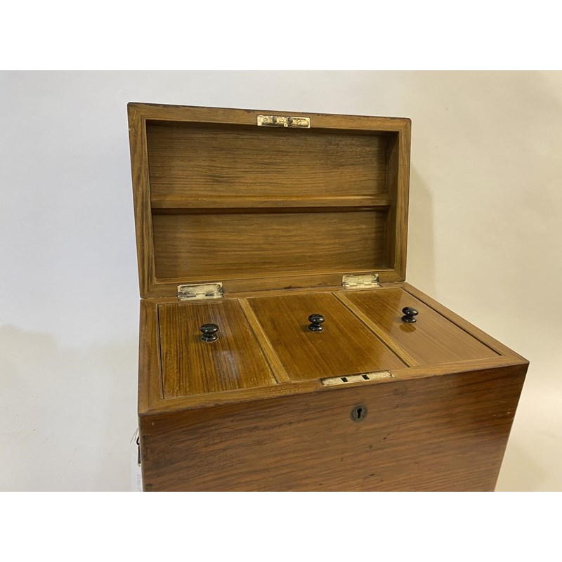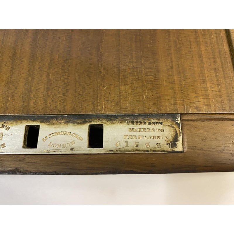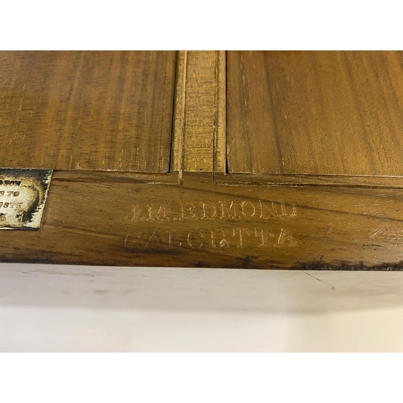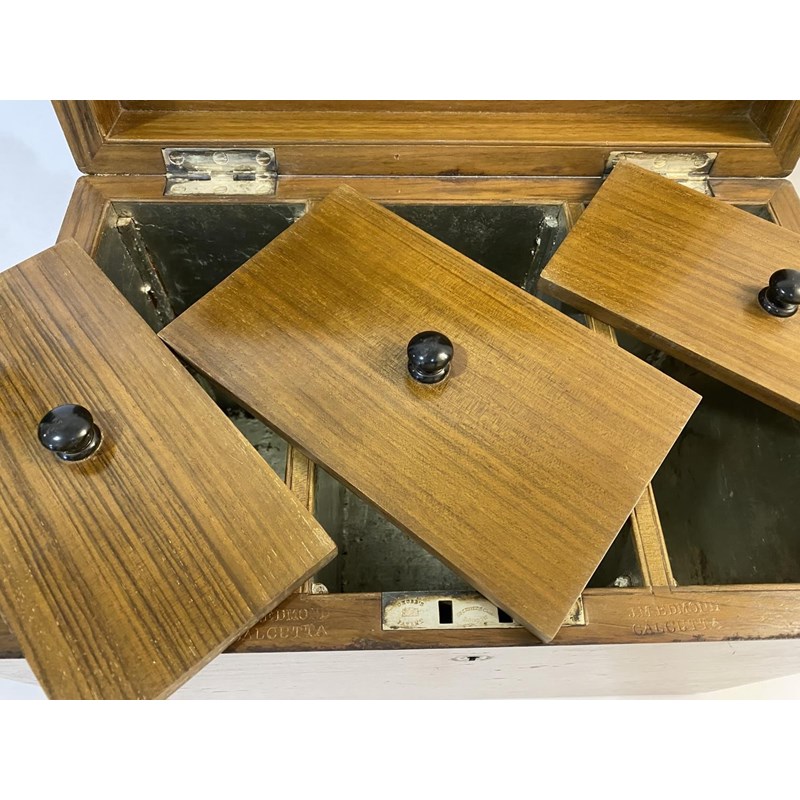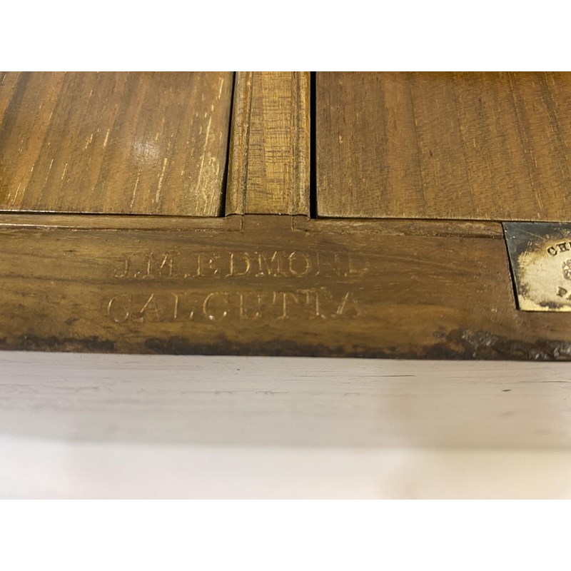 A large rectangular campaign tea caddy, the lid with an engraved brass tablet 'B.F. Alexander Rifle Brigade', the sides with flush fitting carrying handles, the interior with three large tea compartments with ebonised knob handles, the box with silvered hinges and lock, the lock engraved 'Chubb's Patent, 57 St Paul's, London .. Makers to her Majesty' and numbered '415337', also stamped twice for J.M. Edmond, Calcutta. With key, 31cm high, 41.5cm wide and 26cm deep.