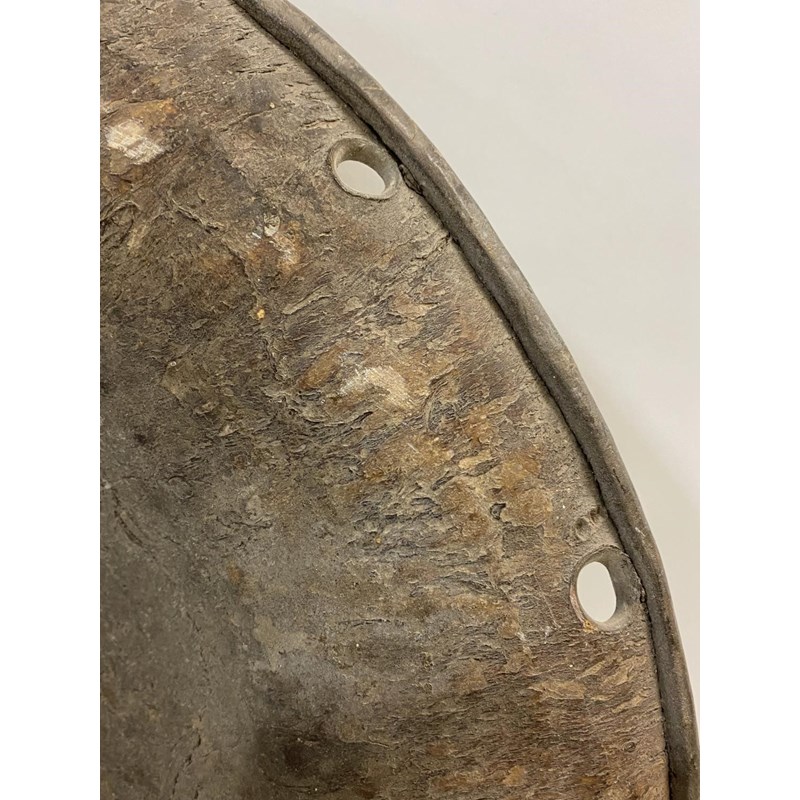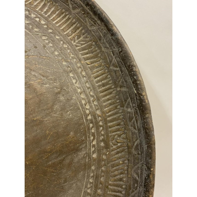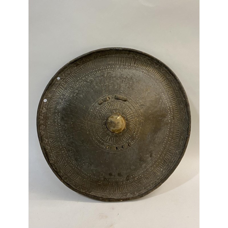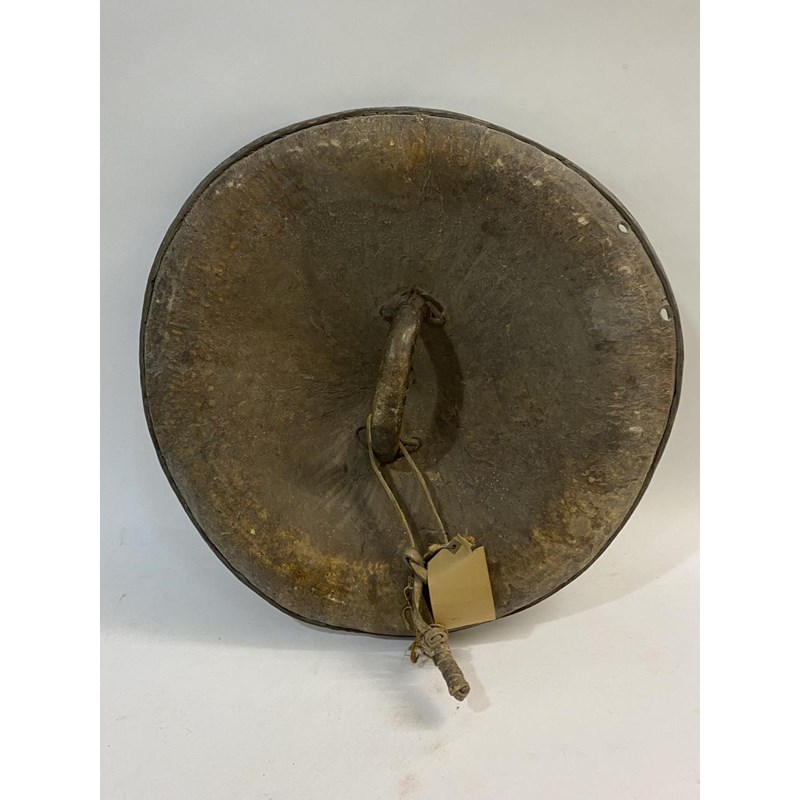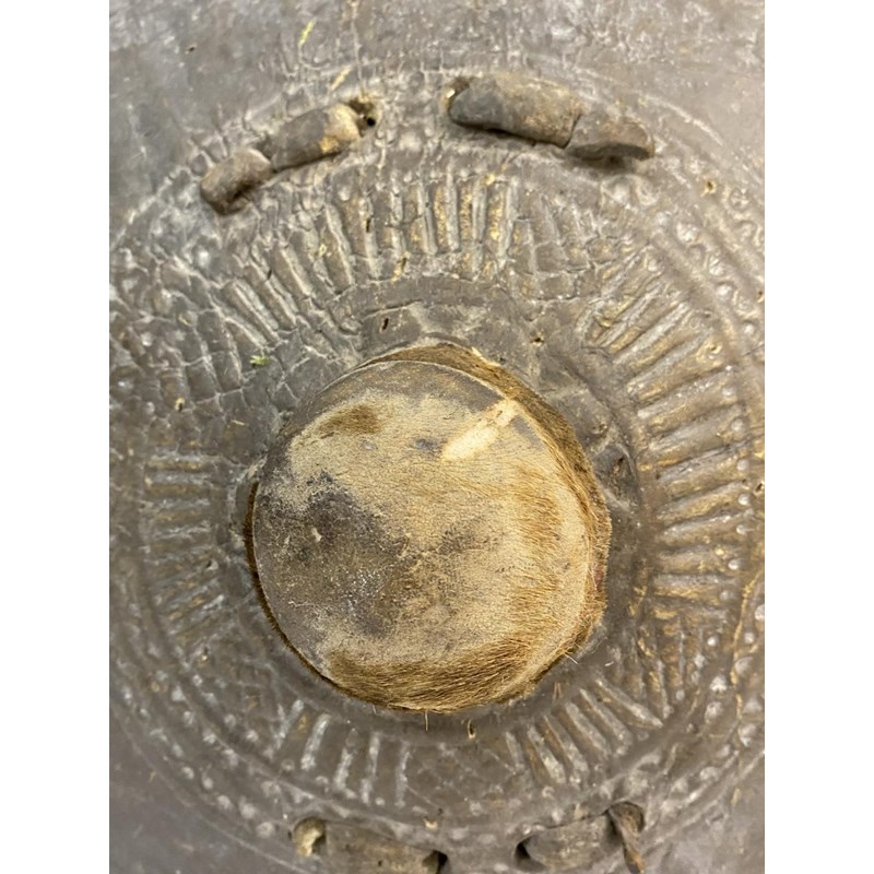 A LARGE CRICULAR SOMALIAN SHIELD. Of thick cow hide with a raised central boss with skin cover, the shield with turned border and incised decoration, with loop handle to the reverse, 57cm diameter.