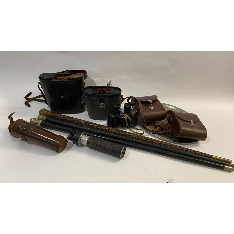 A pair of Bino Prism No2 Mk 2 binoculars with Government issue arrows, a Transex sighting device in leather case, a pair of Carl Zeiss binoculars 8 x 30 in carrying case, A pair of Sankyo 10 x 50 binoculars in case, a pair of Boots 8 x 40 binoculars, two masonic cane sword cases and other items.