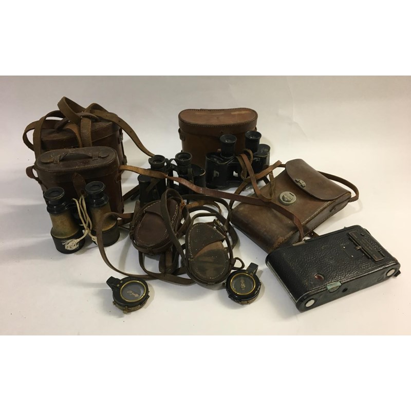Comprising a 1916 Verner's pattern compass by Cruchon & Emons, the leather case stamped B. Stafford, another similar, the case stamped C&R Brinsley 1916, Cased binoculars by Lemaire of Paris, a pair marked 'Military Stereo 6x30, a third pair and a Kodak folding camera. (6)