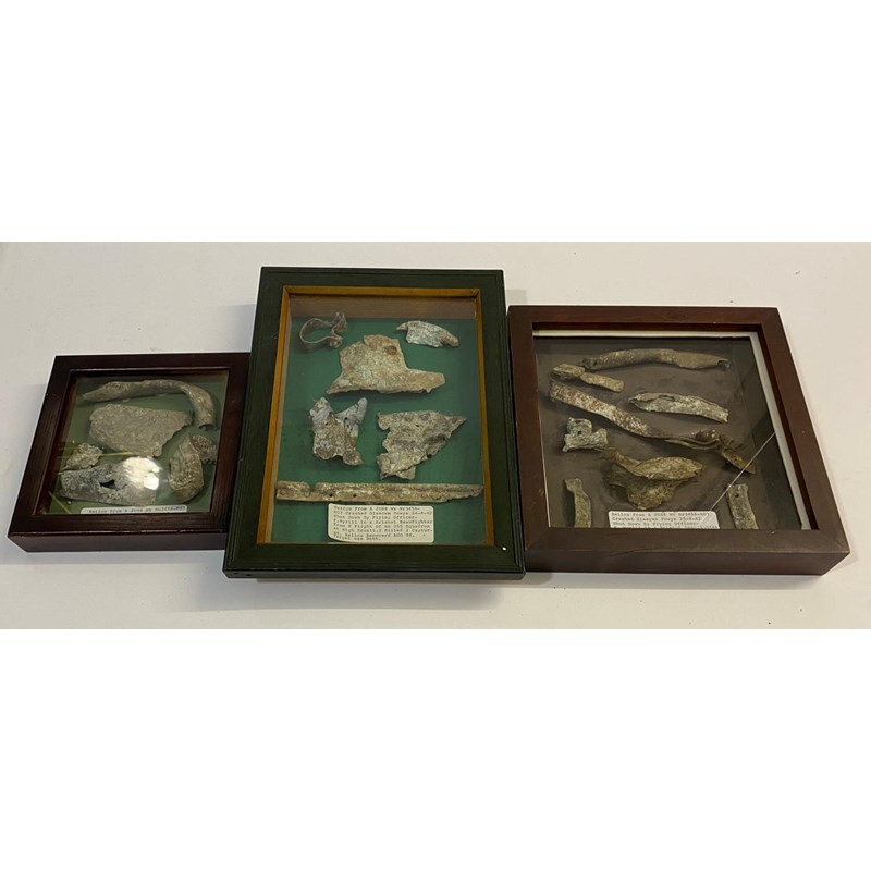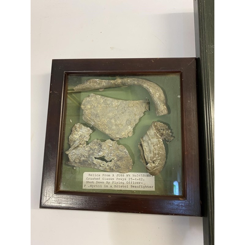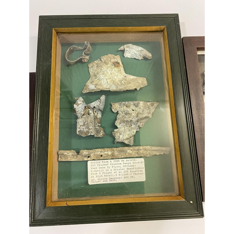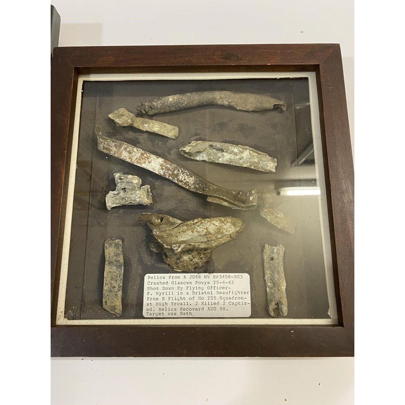 A selection of fragments from a crashed Junkers JU 88. with attached label 'Relics from A JU88 Wk No3458-KG3. Crashed Glaswyn Powys 25-4-42. Shot down by Flying Officer F. Wyrill in a Bristol Beaufighter from B Flight of No 255 Squadron at High Ercall. 2 Killed 2 Captured. Relics recovered Aug 98. Target was Bath.' 18 fragments mounted in three glazed cases.