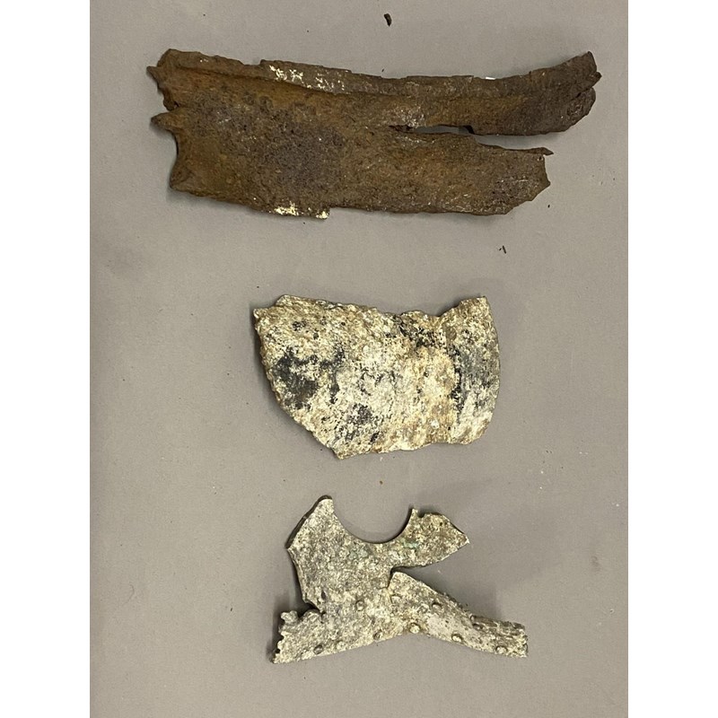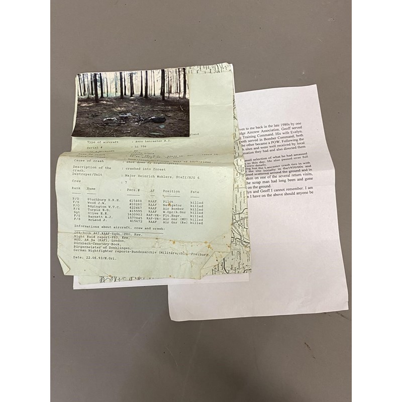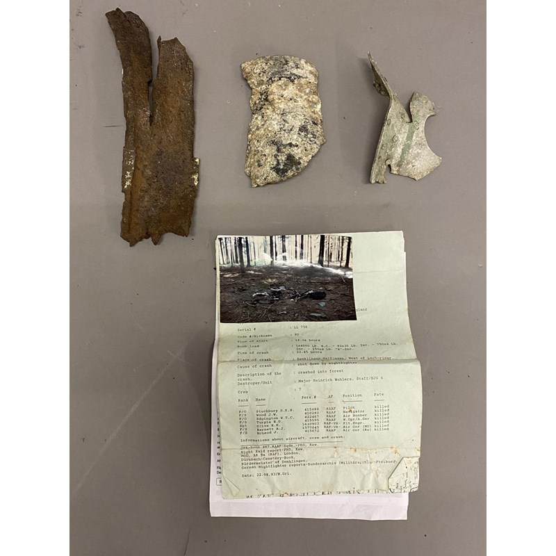 Three large fragments from a crash sight, possibly including part of an oleo Leg structure. Apparently from the crash sight west of the Lech-river, West of Munich. The crash report for LL756 records that it was shot down on a bombing mission by night fighters on the 25/26 February 1944. These fragments originally recovered by Geoff Paine who served as a pilot in Flying Training Command. Sold with a photograph of the crash site and accompanying documents.