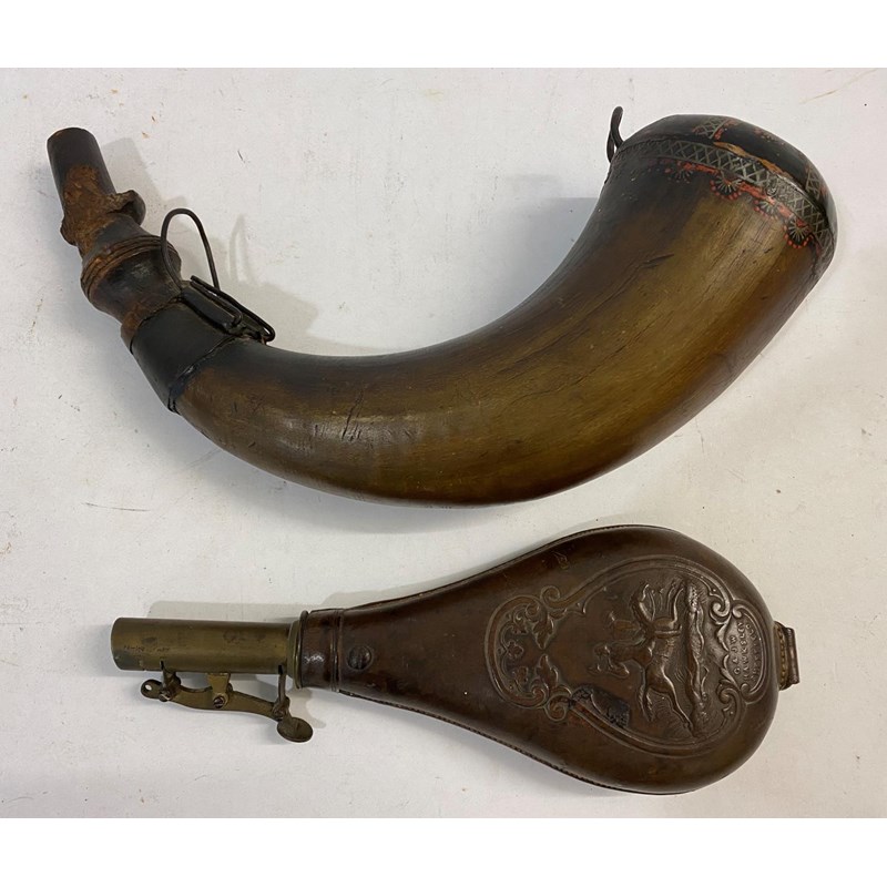 A 19TH CENTURY HORN FLASK AND A SHOT FLASK.