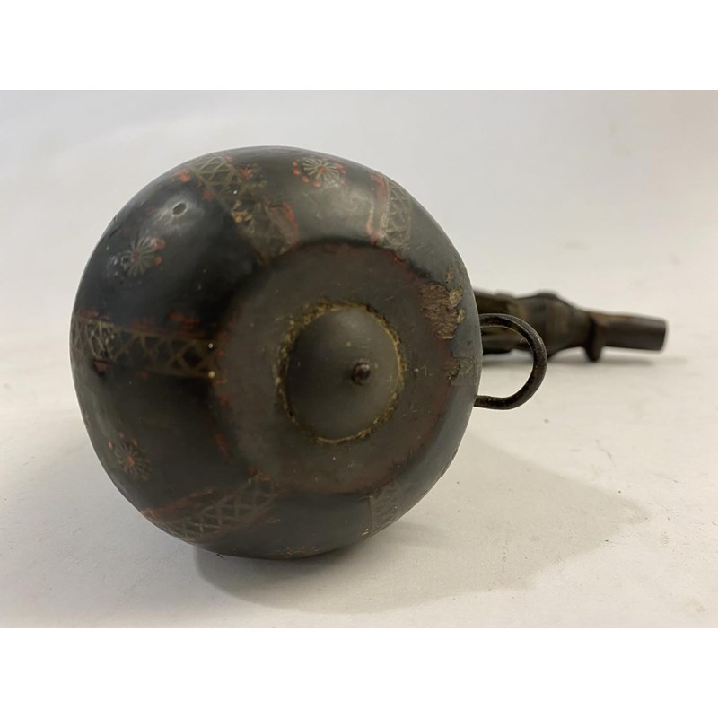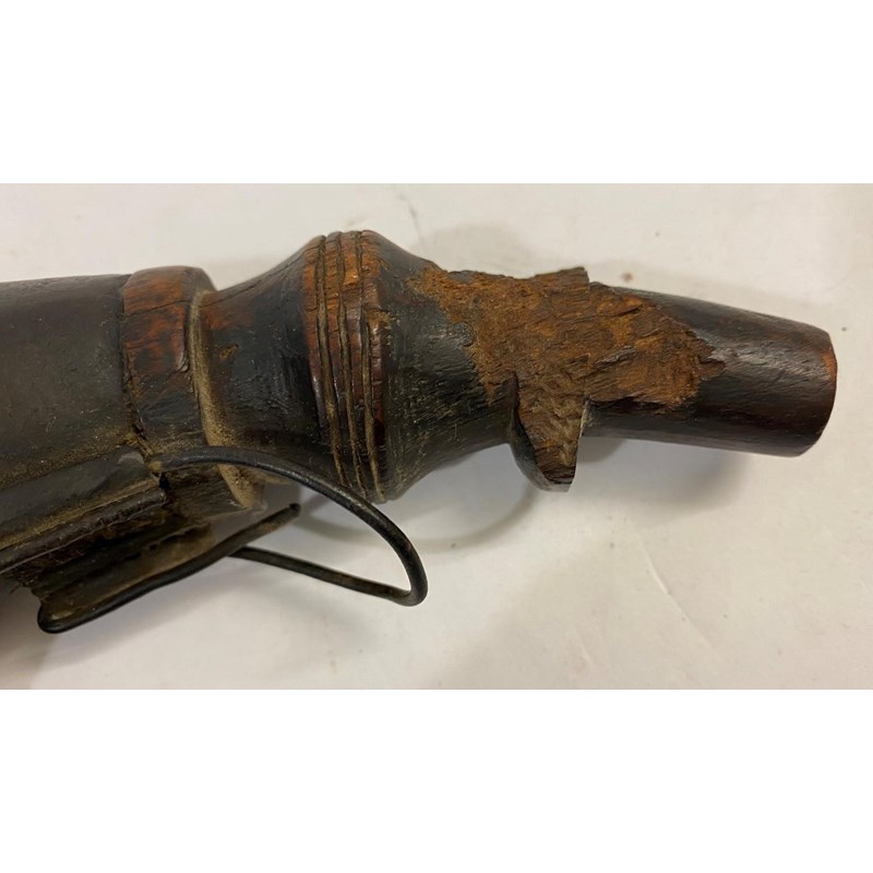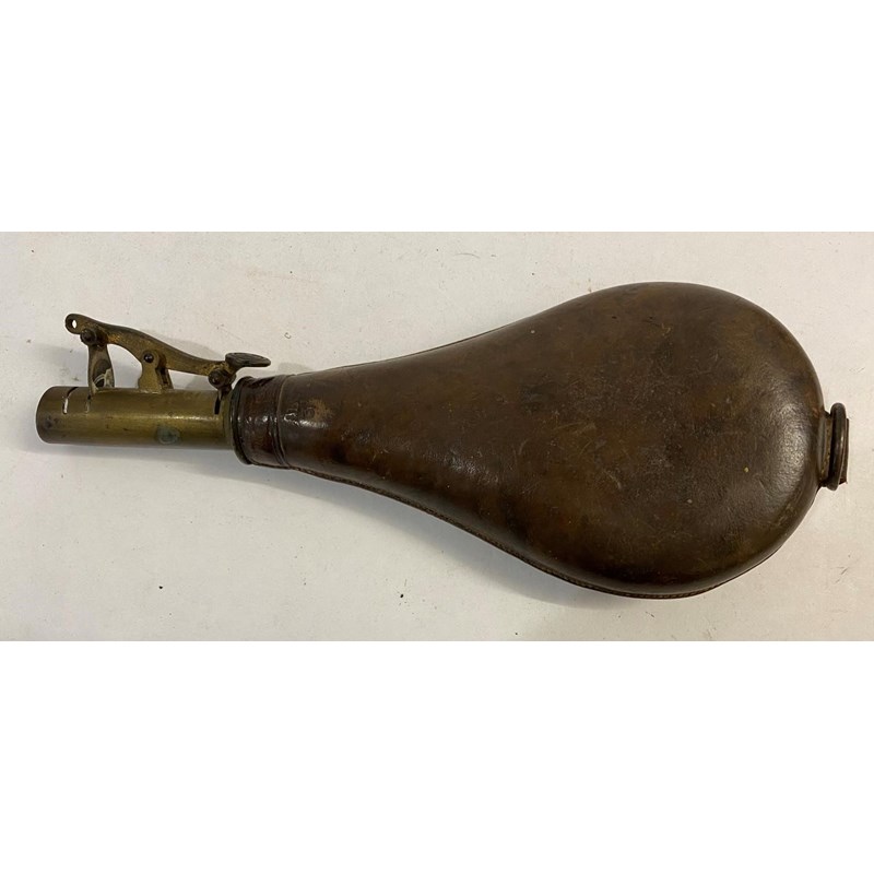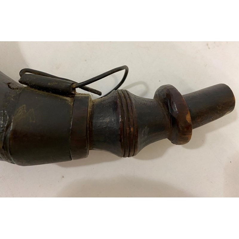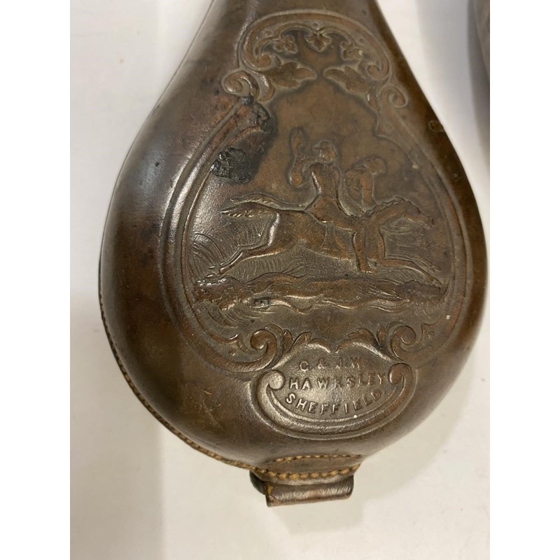 A 19th Century continental horn powder flask with shaped wooden pouring spout and painted rounded end, with wire hanging loops, 27cm wide and a leather shot flask by C & JW Hawksley Sheffield, embossed with a scene of two huntsmen on horseback, 22cm. (2)