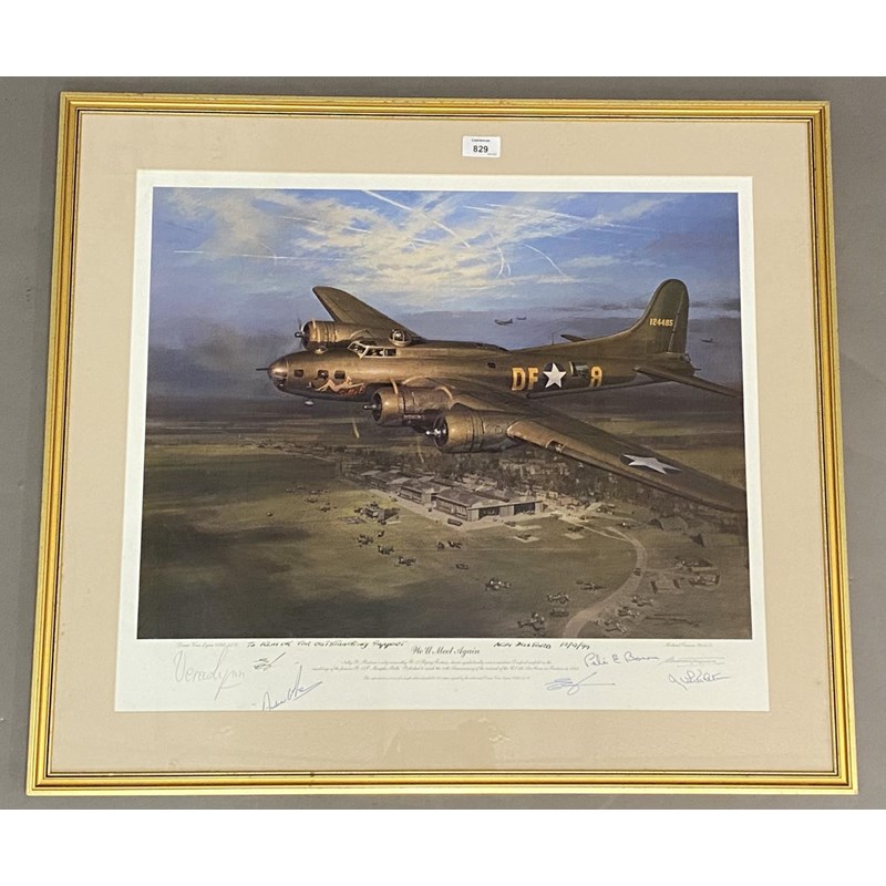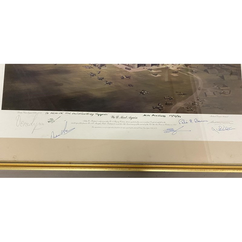 Colour print of 'Sally B' Britain's only airworthy B-17 Flying Fortress ...' signed in pencil by the artist in the margin and with inscription 'To KLM K for Outstanding Support AGM Duxford 12/9/00' with a selection of signatures including Vera Lynn. Framed and glazed, 68 x 77cm overall.