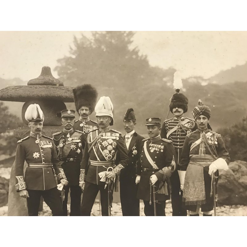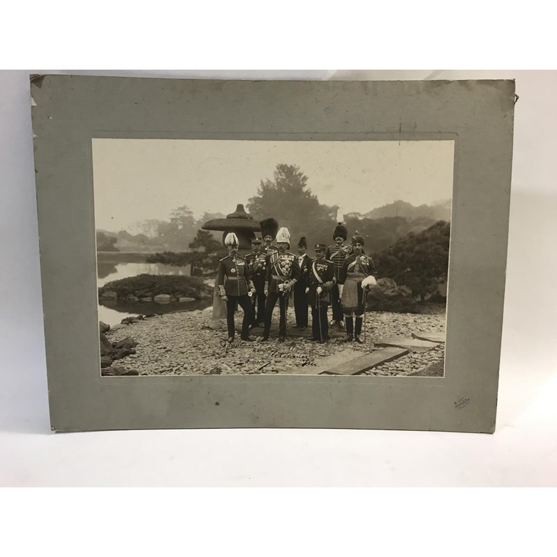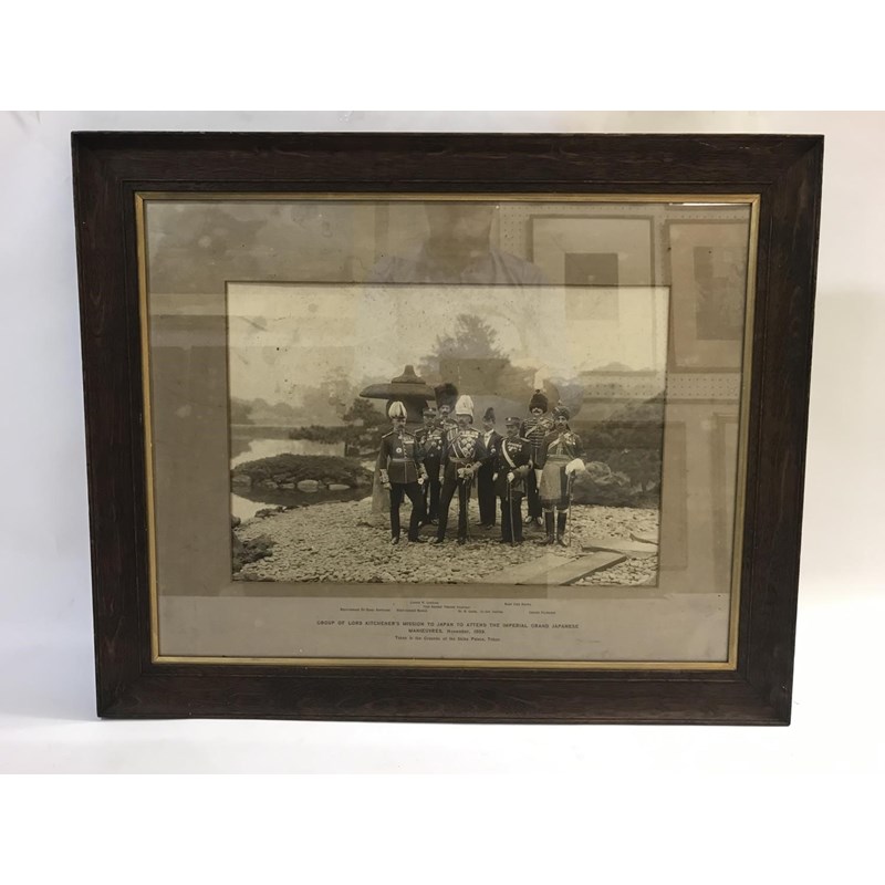 Two copies of a photograph taken in the grounds of the Shiba Palace Tokyo of the 'Group of Lord Kitchener's Mission to Japan to attend the Imperial Grand Japanese Manoeuvres, November 1909'. Major-General Sir Henry Rawlinson, Major General Murata, Colonel W. Lambton, Field Marshall Viscount Kitchener, Mr M. Assano, Lt Col. Yoshida, Major Lord Brooke and Captain Fitzgerald, all standing in Dress Uniform wearing Orders and Medals. One copy framed, glazed and mounted with description to the mount, the other unframed, lacking title but with signatures of Rawlinson, Murata, Lambton, Kitchener, Assano, Yoshida and Brooke, the mount marked for a photographer in Japan. Image, 28.5 x 42cm, in mount 42cm x 55. Framed example 53 x 65cm.