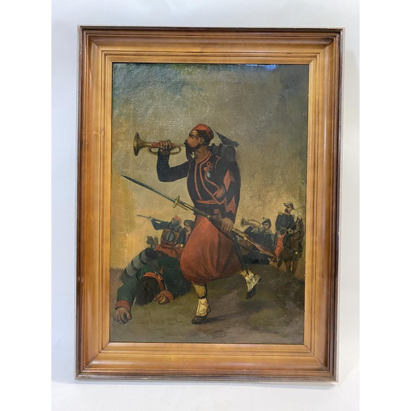 The soldier standing looking towards the battle, blowing his bugle, with soldiers and fallen enemy around him, oil on canvas, 58 x 41cm, indistinctly signed or marked to the reverse, 'Borsate G.1802', in moulded frame, 71 x 54cm overall.
