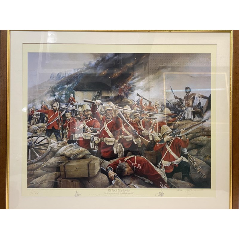 'THIS HEROIC LITTLE GARRISON' RORKES DRIFT PRINT. A colour print after John Collingwodd 'This Heroic Little Garrison' signed in pencil in the margin and numbered 21/50 A.P. framed and glazed, 69 x 83cm overall.