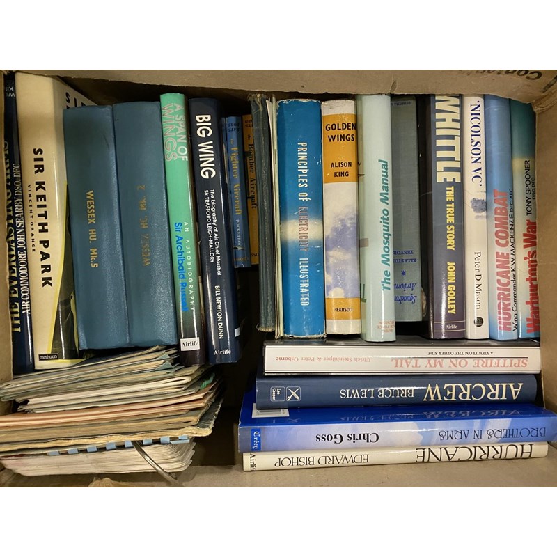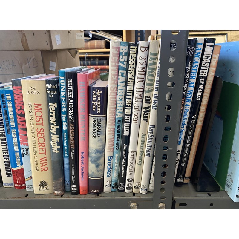 A LARGE AND VARIED COLLECTION OF BOOKS ON THE HISTORY OF THE R.A.F. A collection of books to include 'Enemy Coast Ahead' by Guy Gibson, 'The Mosquito Manual' and many others. Approximately 54 volumes.