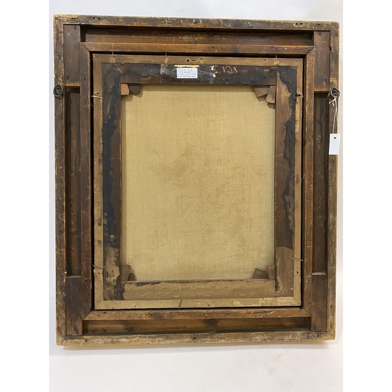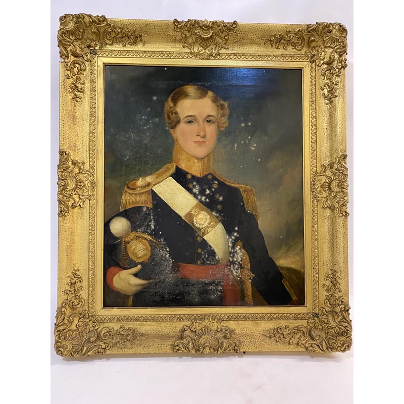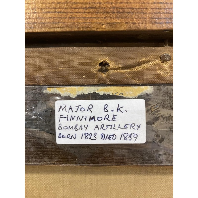 MAJOR B. K. FINNIMORE OF THE BOMBAY ARTILLERY. A half length portrait of Major Finnimore in uniform, oil on canvas, 60 x 50cm, in gilt frame, 80 x 70cm with a label to the reverse identifying the sitter as Major Finnimore 1823 - 1859.