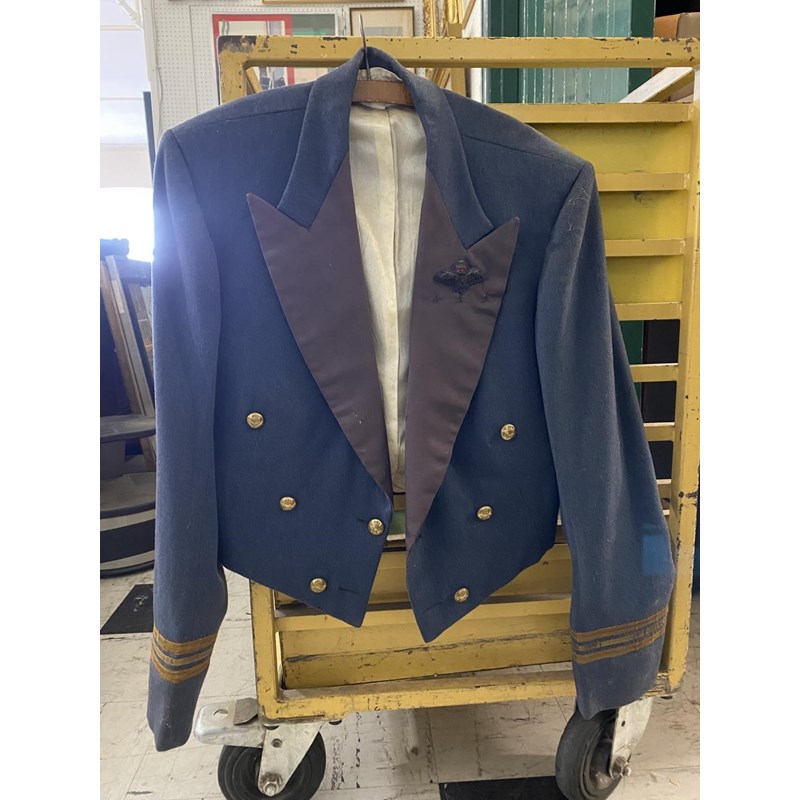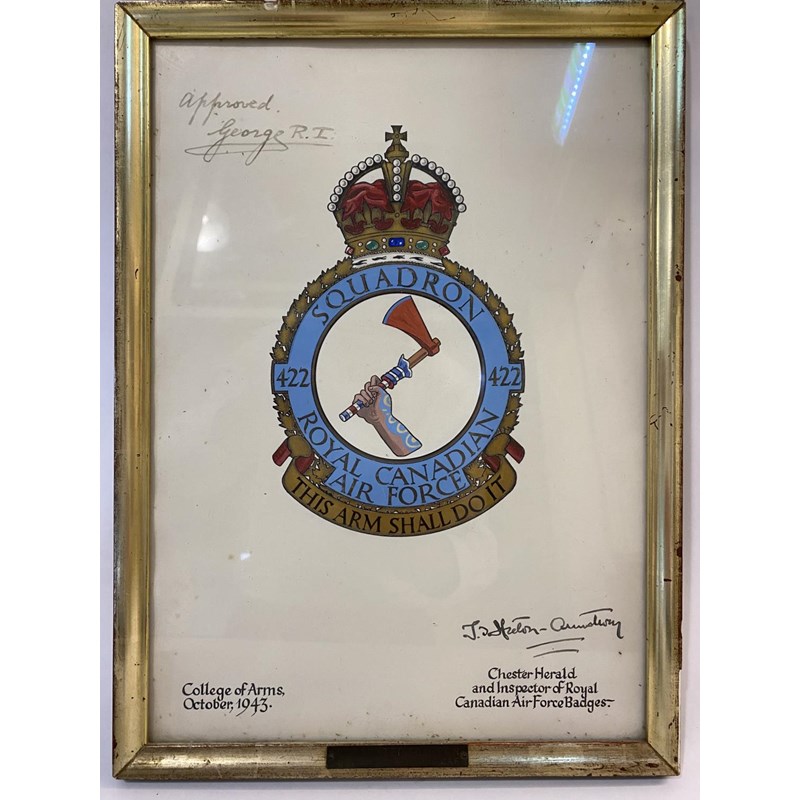 A painted and gilt Royal Canadian Air Force Crest, 422 Squadron, with legend 'This arm shall do it', the crest suggests that a Red Indian brave is at war, the Shakespearian motto refers to the squadrons strikr power. Top left signed 'approved George R.I.' beneath the crest 'College of Arms, October 1943. and Chester Herald and Inspector of Royal Canadian Air Force badges, framed and glazed, with an engraved tablet 'Presented to 16 SQN RAF by 422 (F) Sqn RCAF'. 38.5cm x 28cm. With an RAF Mess Jacket with rank for Squadron Leader by Moss Bross. 422 RCAF was formed as a General Reconnaissance unit at Lough Erne, Fermanagh, Northern Ireland on 2nd Aapril 1942, flying Catalina and Sunderland flying boats on convoy escort and anti-submarine patrols over the North Atlantic shipping route and the Bay of Biscay. The squadron was disbanded on 3rd September 1945.