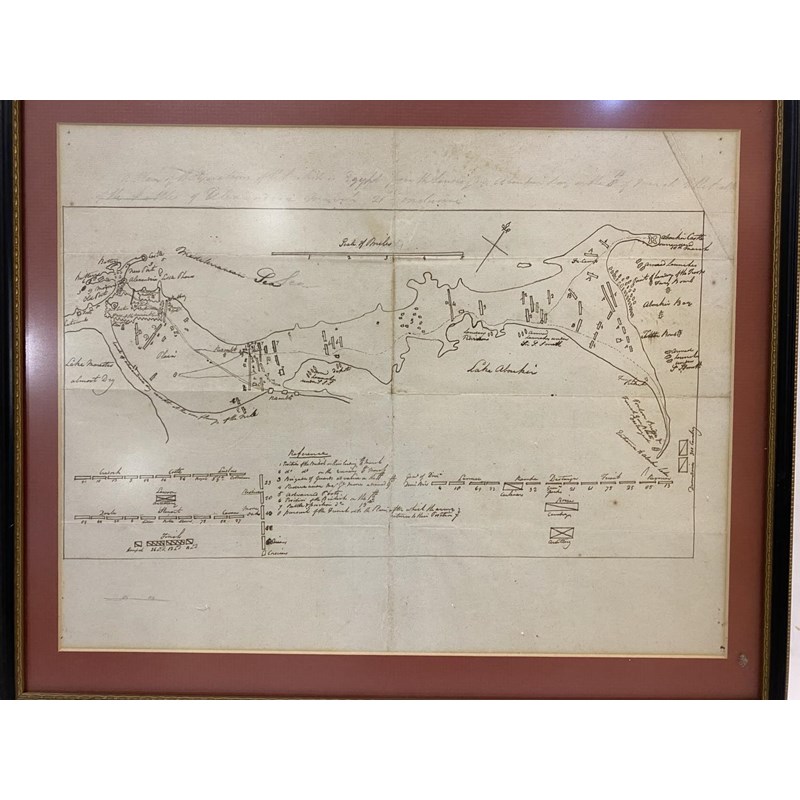 AN INTERESTING SKETCH OF BRITISH TROOPS IN EGYPT 1801. A pen and ink drawing of troop positions, a title above indistinctly written in pencil 'a plan of the position of the British in Egypt - Landing at Aboukir Bay 8 March 1807 up to the attack on Alexandria 21 May 1807'. Framed and glazed, 38cm x 46cm overall. *It seems the invasion of Egypt took place in 1801 not 1807 as stated, and that this may be a copy of W. Faden's print published on 28th May 1801.