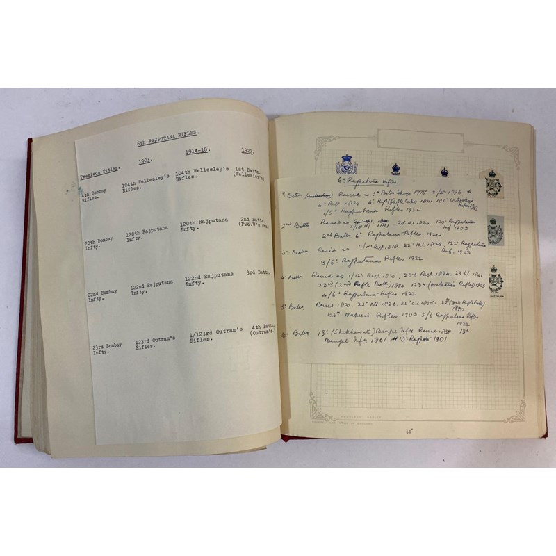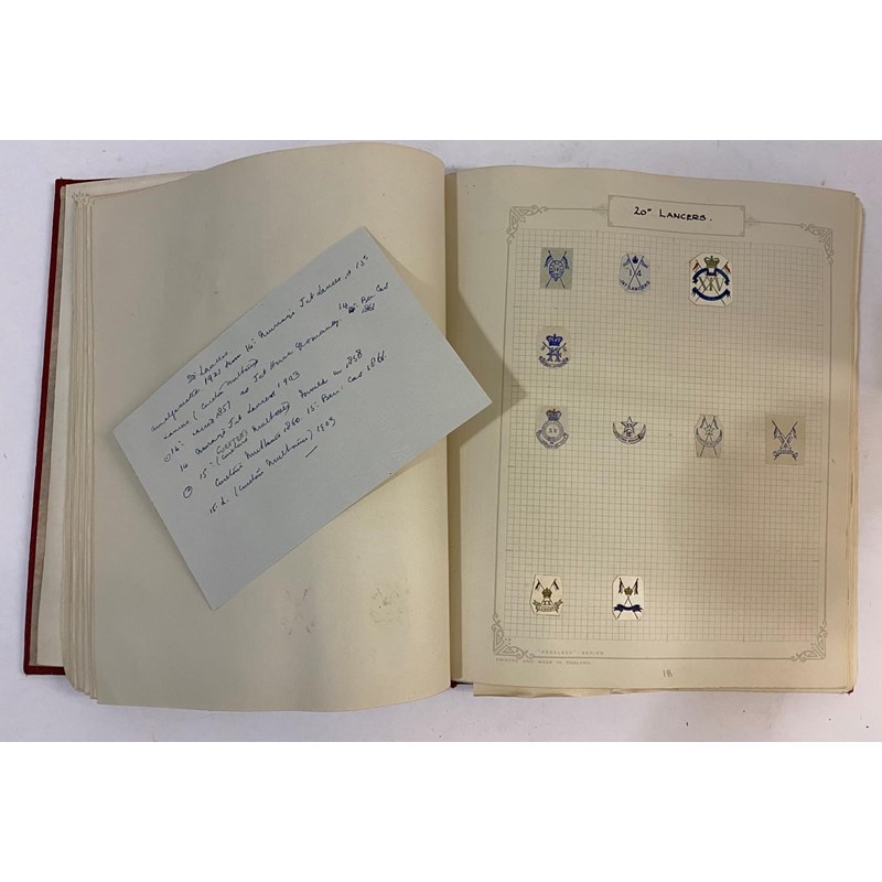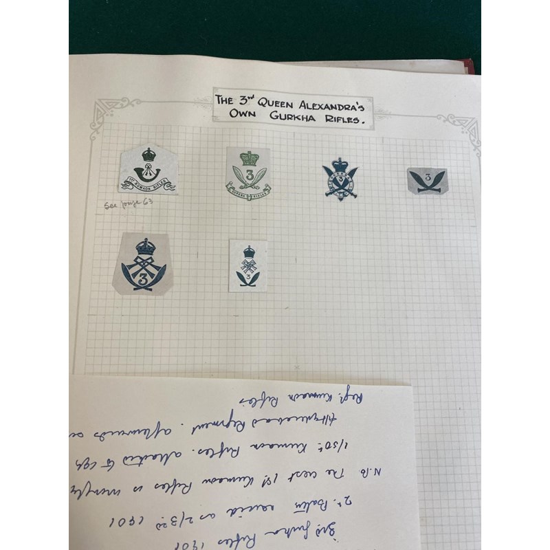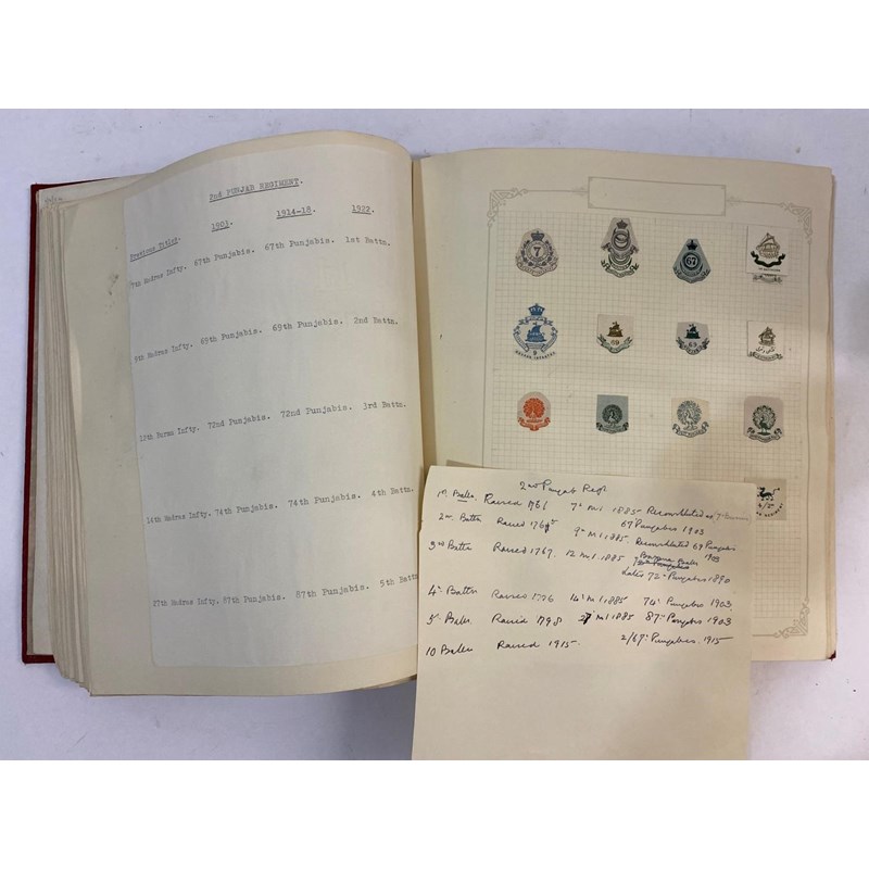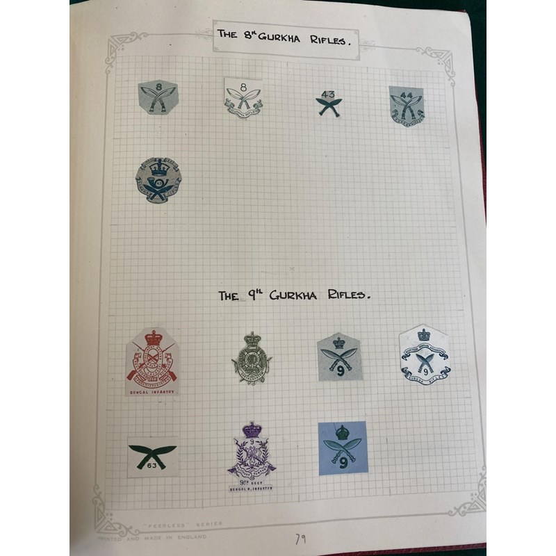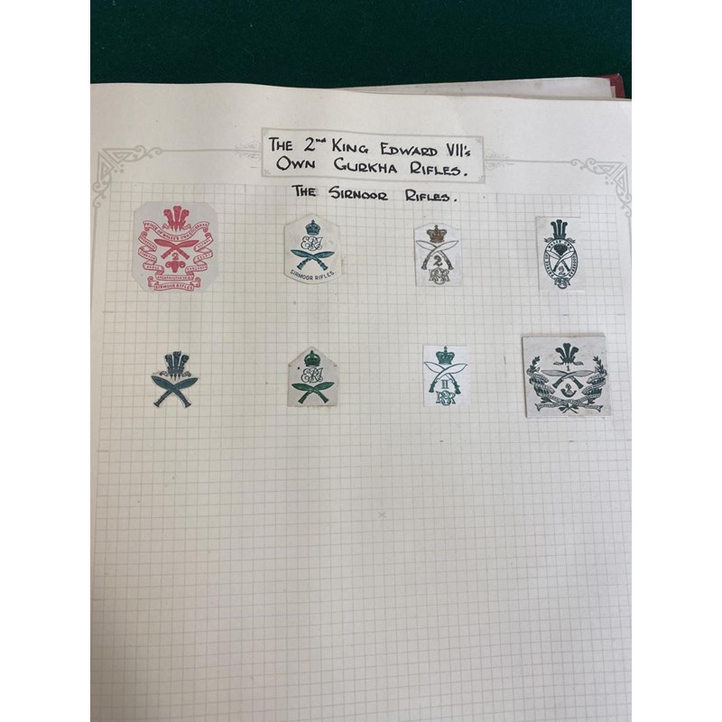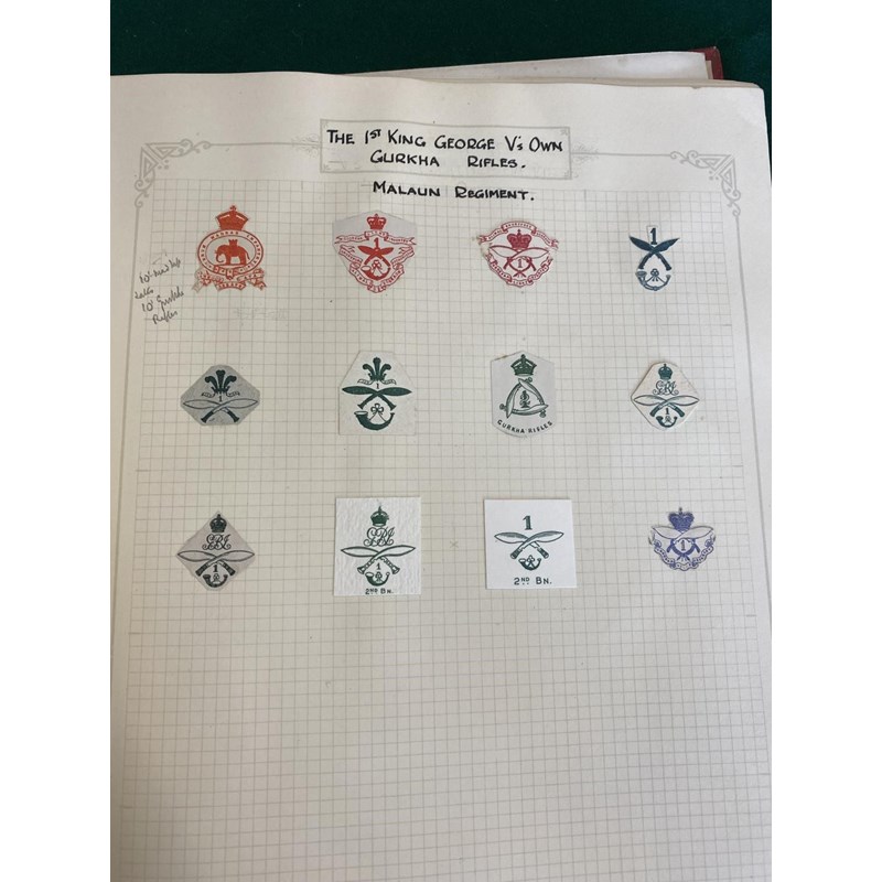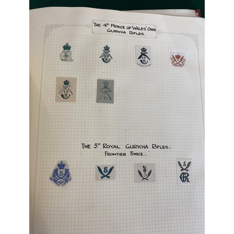 An extensive collection of military crests to include numerous different Regiments, many from India such as the 1st Punjab Regiment, Gurkhas, Auxillery Forces, Cavalry and others, bound in an album with historical notes tracing the evolution of the crests. Approximately 80 pages.