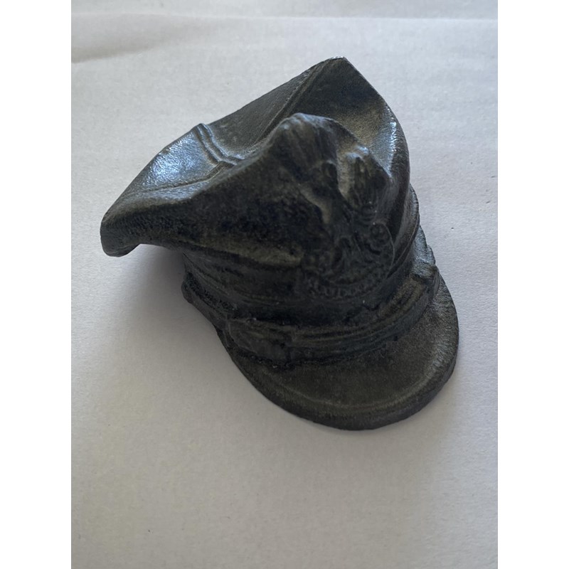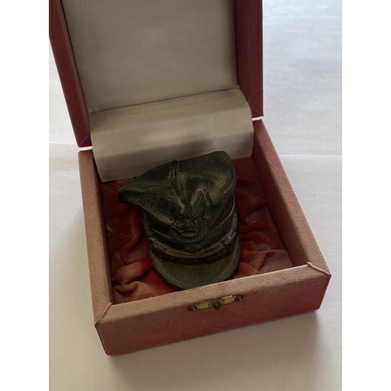 A PRESENTATION PEWTER MODEL OF A SYRIAN MILITARY CAP. In a presentation red box, the hat 5cm high, 8cm wide.