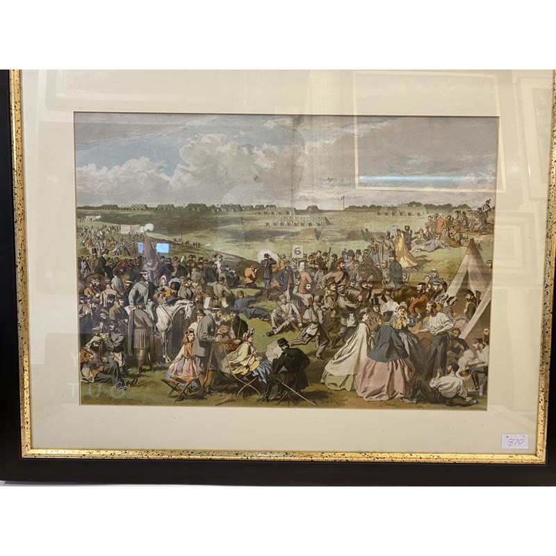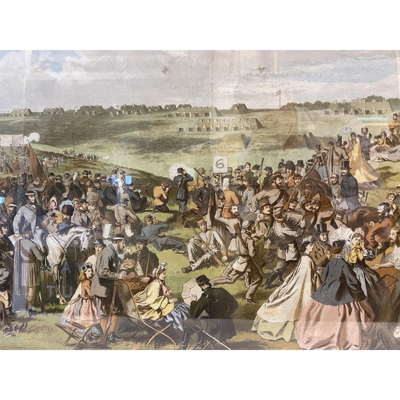 A colour chromolithograph depicting a busy day at the first meeting of the Volunteer Rifle Company at Wimbeldon common c1860, produced for the Illustrated London News, originally folded in four, framed and glazed, 42 x 59cm visible, 65 x 83.5cm overall.