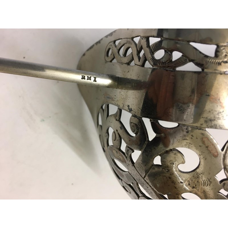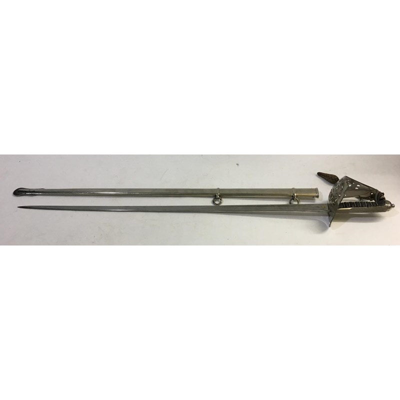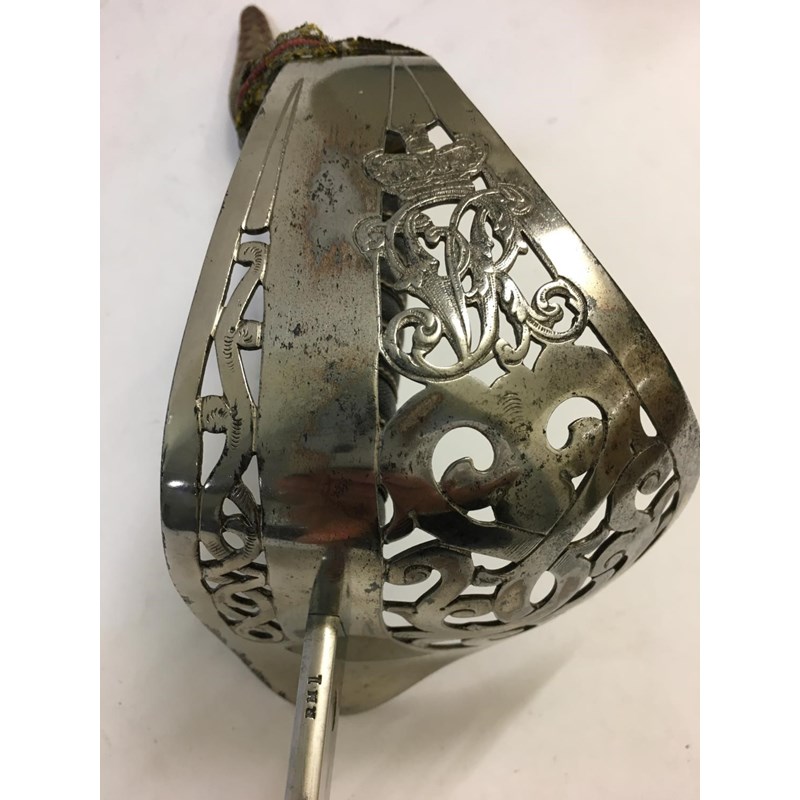 With an 84cm partially fullered pointed blade with polished etched decoration with a crown above 'Gibraltar' a globe and 'Per Mare Per Terram' with Royal Cypher to the other side, stamped RM1 to the back, with a broad three-quarter guard pierced with VR beneath a crown, with wire wound shagreen handle and attached sword knot. The polished scabbard with twin ring suspension. 101cm overall.
