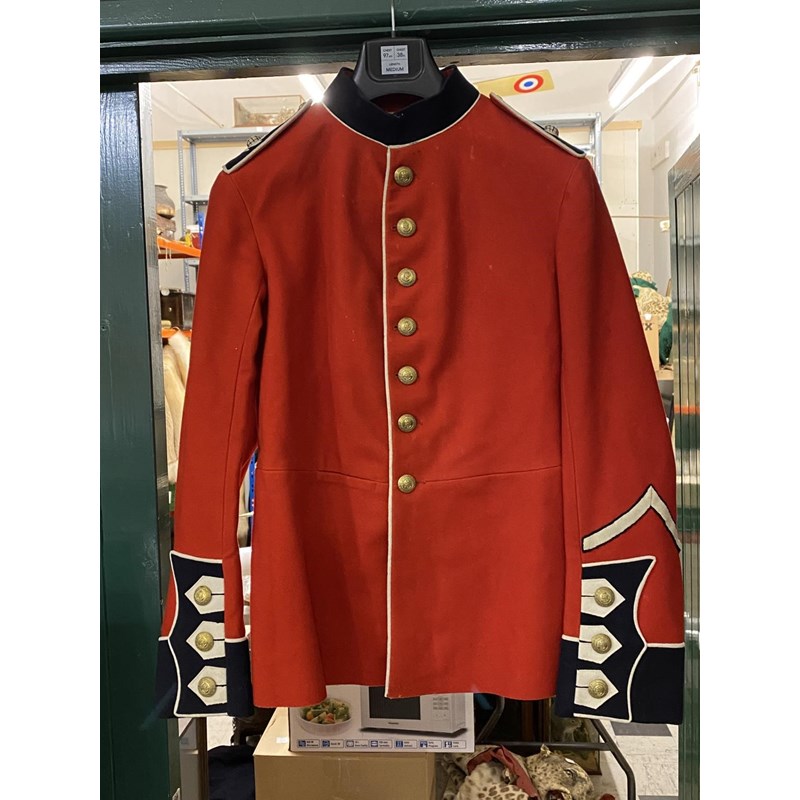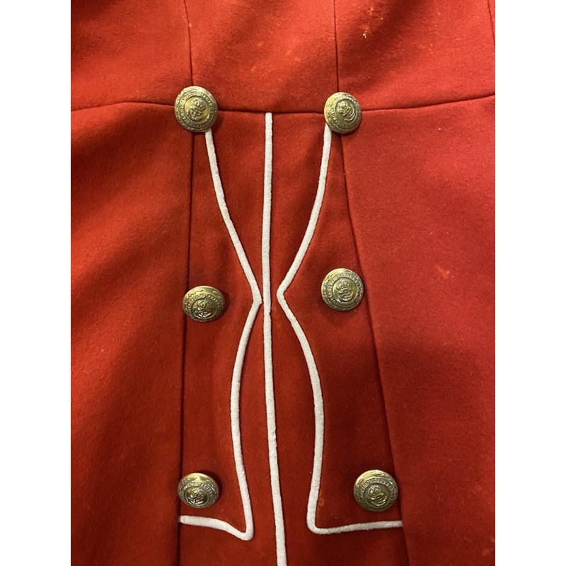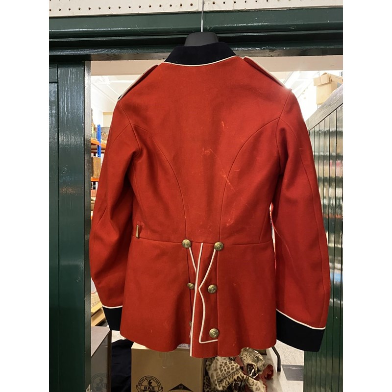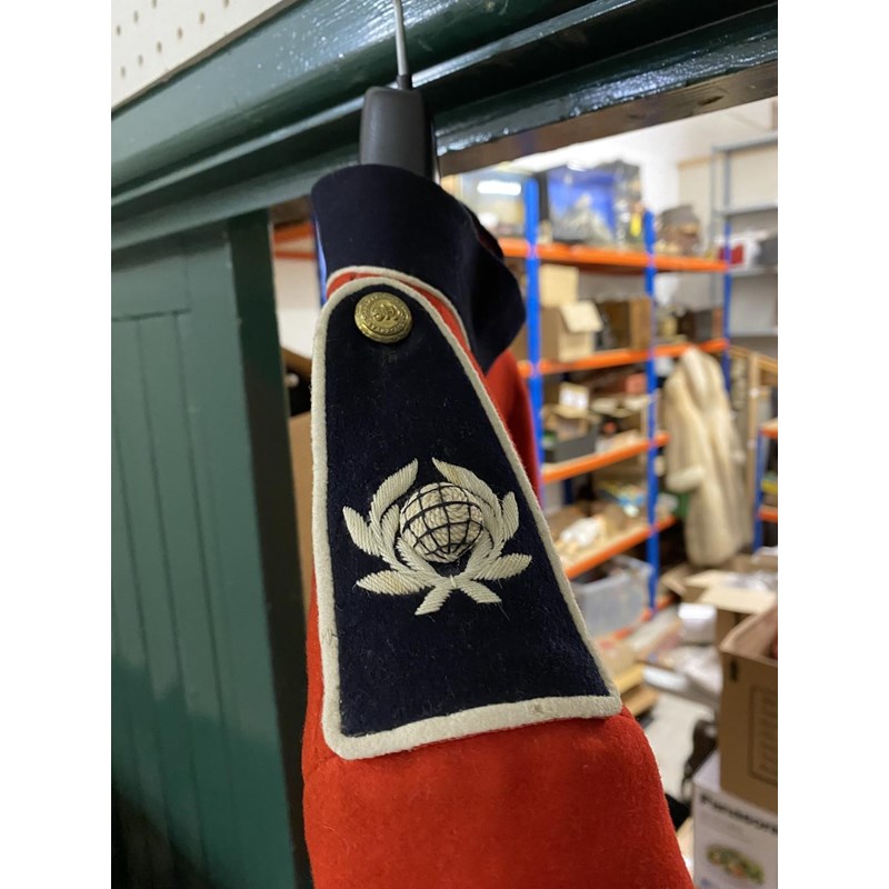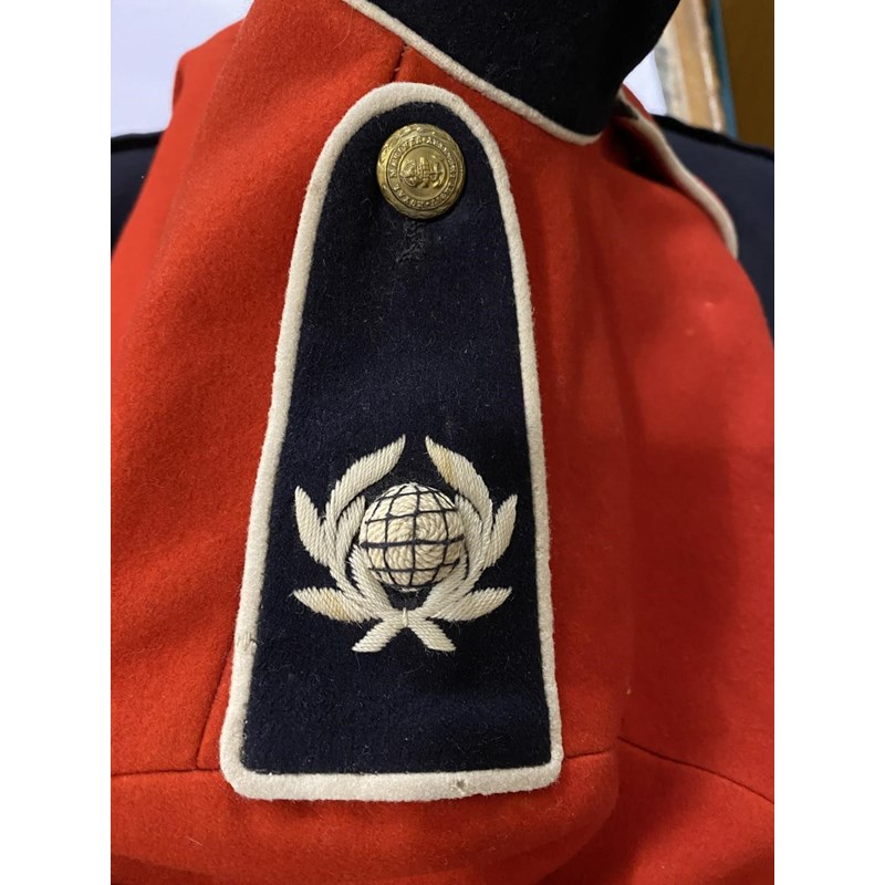 A uniform by Rogers John Jones Ltd of Mayfair, the label named 'Lt C.J. Goode, the jacket with Royal Marine buttons and collar badges, the shoulders with three pips for the rank of Captain, with parachute wings and Medal ribbon for British Empire Medal, with tie, shirt and trousers with red stripe. With an earlier Royal Marines Scarlet jacket with brass buttons and elaborate three button cuff.