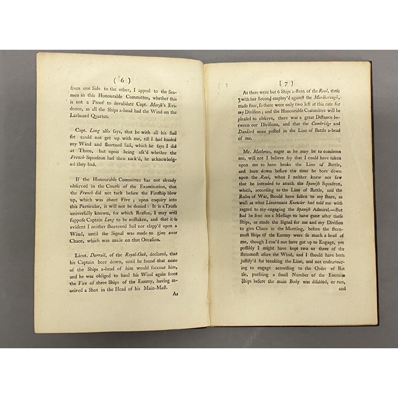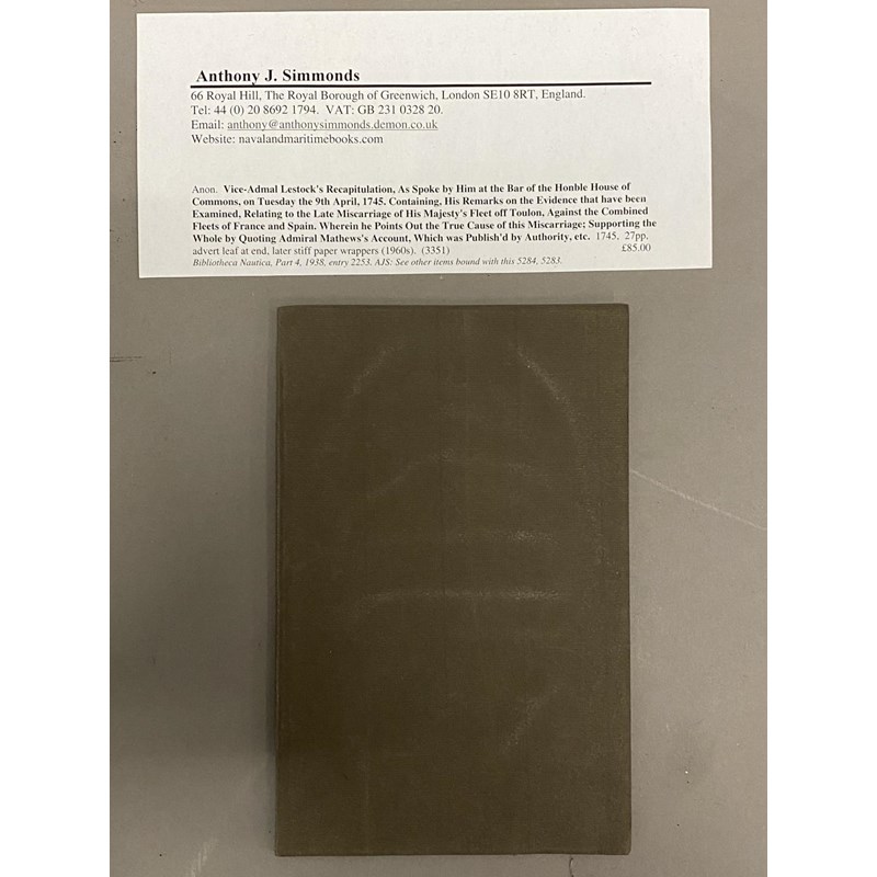 A 27 page pamphlet being the words spoke by Vice Admiral Lestock at the Bar of the House of Commons on Tuesday 9th April 1745. Remarks in relation to the late miscarriage of his Majaesty's Fleet off Toulon against the combined Fleets of France and Spain. In later card covers.