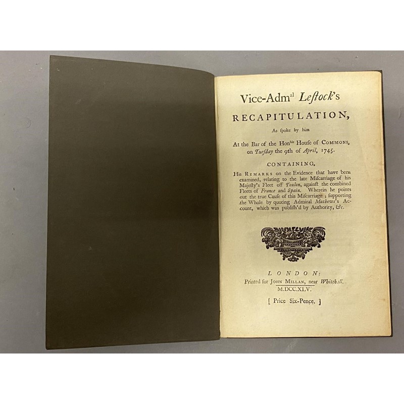 AN 18TH CENTURY PAMPHLET VICE ADMIRAL LESTOCK'S RECAPITUALTION.