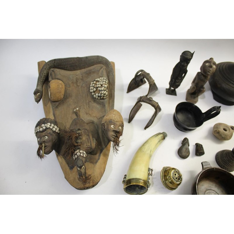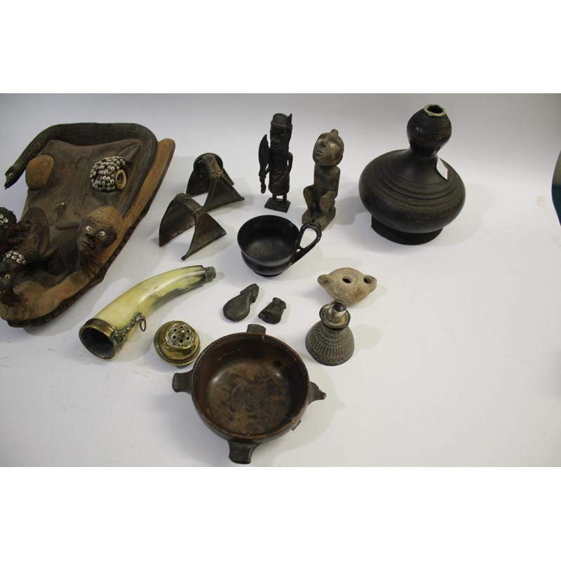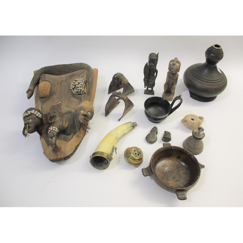 including a Papua New Guinea tribal mask, an ethnic blanket, a small bronze tribal figure and a wooden figure, horn flask, roman style lamp, metal stirrups, gourd, and other items.