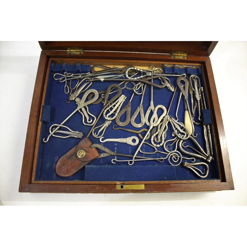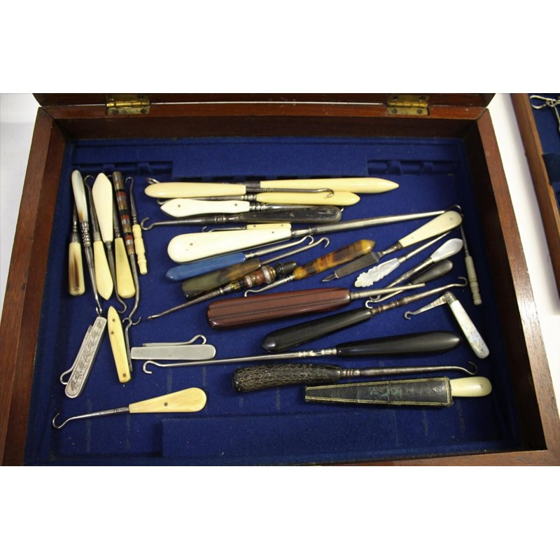a collection of various button hooks, including various metal advertising examples, a silver bladed button hook with mother of pearl handle, bone and ivory handled examples, wooden handled examples etc. With two reference books on button hooks and in a mahogany box.